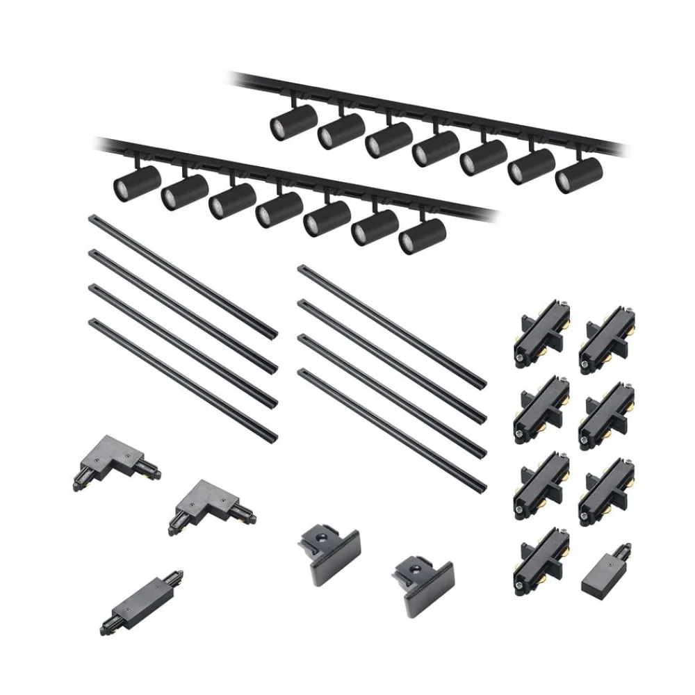 – 14 x skinnespots – 8 x skinner (100 x 3,6 x 1,8 cm) – 2 x hjørneforbindere (6,5 x 6,5 cm) – 1 x endetilkobling (6,5 x 3,5 cm) – 1 x centertilkobling (9,5 x 3,5 cm) – 7 x længdeforbindere (6,1 x 3,5 cm) – 2 x endehætte (3,5 x 1,78 x 2,3 cm) Bemærk, at Linaro skinnesystemet kun er kompatibelt med tilbehør fra Linaro-sortimentet. For at undgå forveksling med andre systemer må du kun kombinere tilbehør og skinnesystemer fra serien med samme navn.