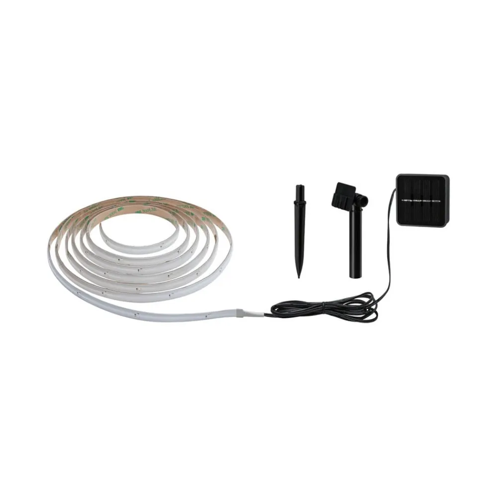 Solar LED-strip 78897 med skumringssensor, solpanel og genopladeligt batteri Den tre meter lange LED-strip skaber en hyggelig atmosfære på altanen eller terrassen eller endda i haven, langt væk fra en strømtilslutning, da den drives af solen. Det eksterne solpanel kan ganske enkelt sættes i jorden eller i en krukke og rettes perfekt ind efter solen. Båndet kan afkortes på de markerede punkter. Den er udstyret med varmhvide LED’er, og bagsiden er selvklæbende, så den er nem at montere. Lyset tændes automatisk i skumringen af skumringssensoren. Afhængigt af mængden af sollys er opladningstiden 4 til 6 timer; når den er fuldt opladet, lyser strimlen i 3 timer.