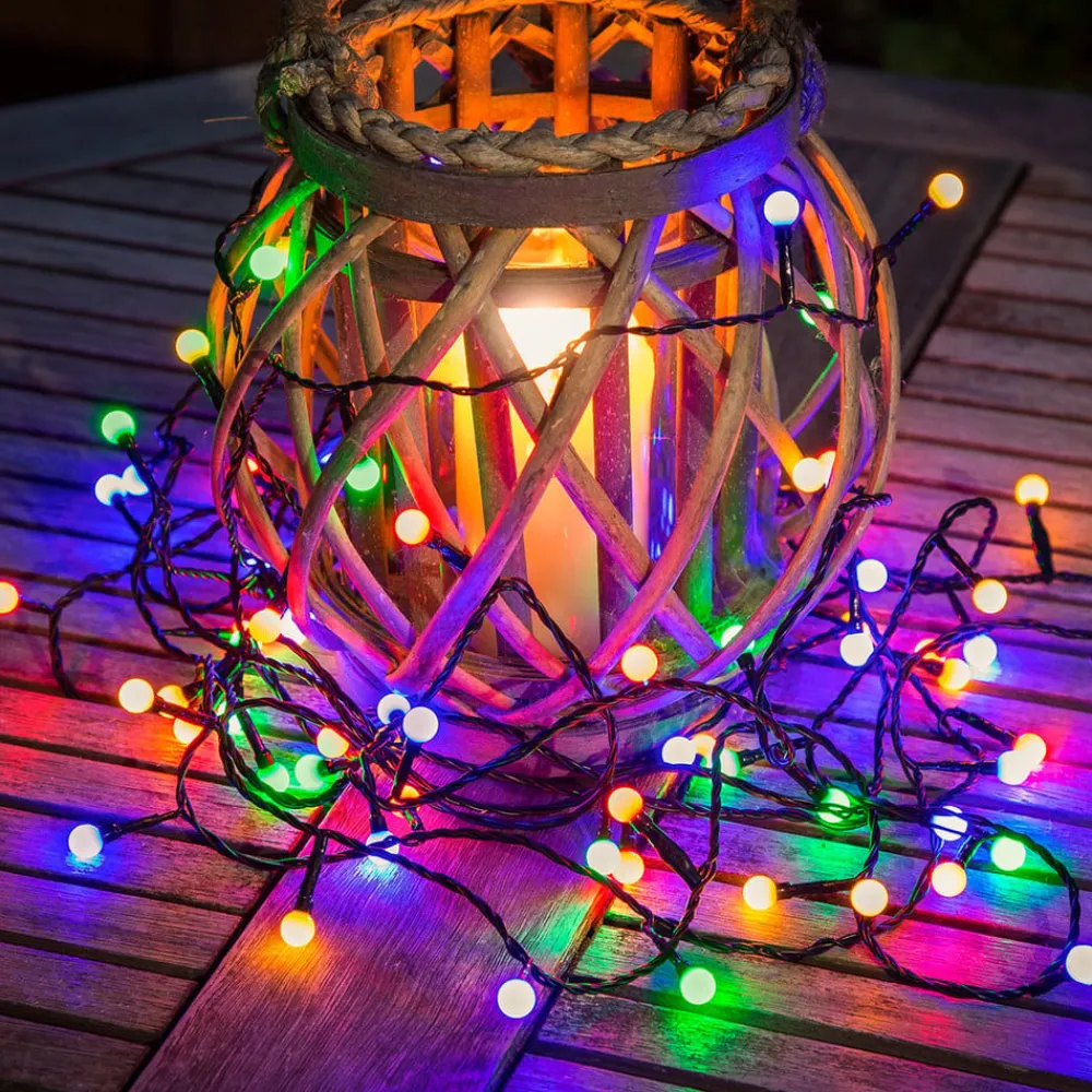 Iøjnefaldende udendørs dekorationer lykkes med farverige, lysende LED-lyskæder – 80 lys Der er mange grunde til at dekorere sit udendørs område om natten og pynte det med passende belysning: f.eks. havefester og hyggelige aftener om sommeren. I de mørke vintermåneder er det julen, der bringer glæden ved oplyste dekorationsgenstande. Lyskæderne er udstyret med 80 runde, farverige LED’er og er designet til udendørs brug med IP44-beskyttelse. Kablet er sort. En udendørs transformer er inkluderet. Bemærk: Pærerne kan ikke udskiftes.