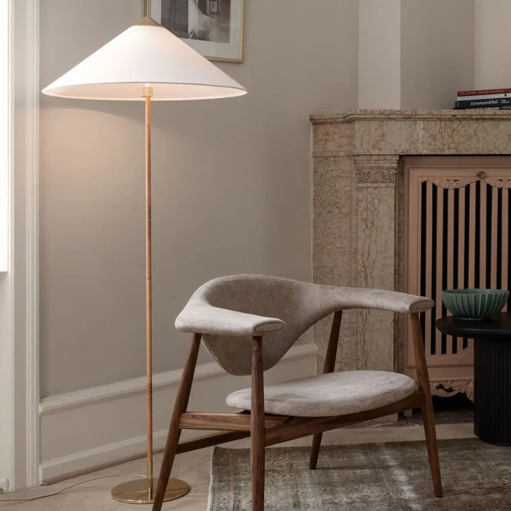 standerlampe 9602 imponerer med sin tidløst elegante skønhed og kan bruges i kombination med adskillige møbler som en effektiv ekstra lyskilde. Den består af en metalbase med messingfinish, hvorfra en stang dækket af rotting strækker sig opad. Denne bærer en skygge, hvis form har givet lampen kaldenavnet “kinesisk hat”.