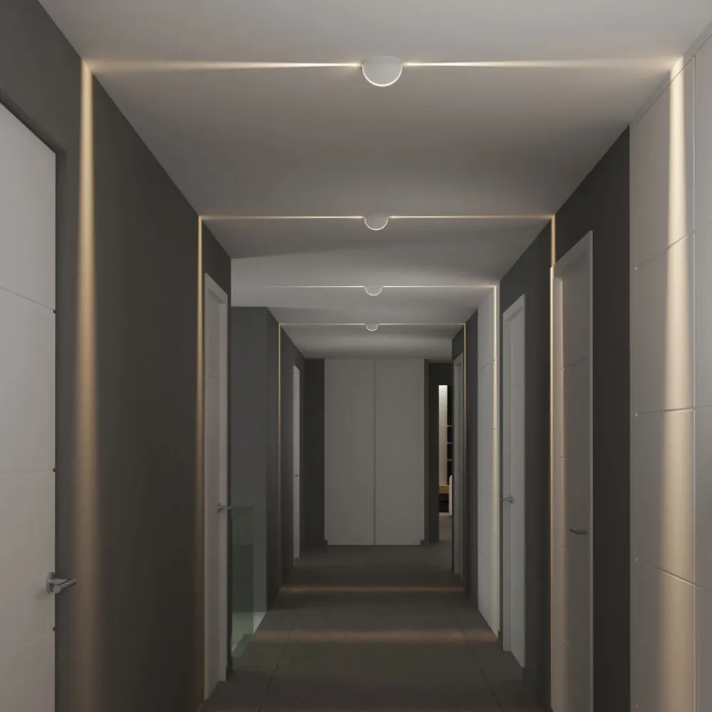 Spectra indbygget LED-loftslampe med unik lysstråle Fascinerende lyseffekter og usædvanlig belysning er mulig med denne Spectra indbyggede LED-lampe. Den er installeret i loftet og har en rund form, hvilket betyder, at den smelter næsten sømløst ind i loftet. En lukket halvcirkel er placeret på dens runde, forsænkede form. Den har en forsænket spalte langs hele kanten, hvor de varmhvide LED’er er placeret. De udsender et kraftigt lys, som skaber spændende lyseffekter i loftet og på væggen. Lysstrålen løber lige langs loftet til venstre og højre som en lysbane og bevæger sig også lige ned ad væggen. Hvis armaturet f.eks. placeres midt i en gang, bliver det helt og fuldt oplyst og viser visuelt vej.