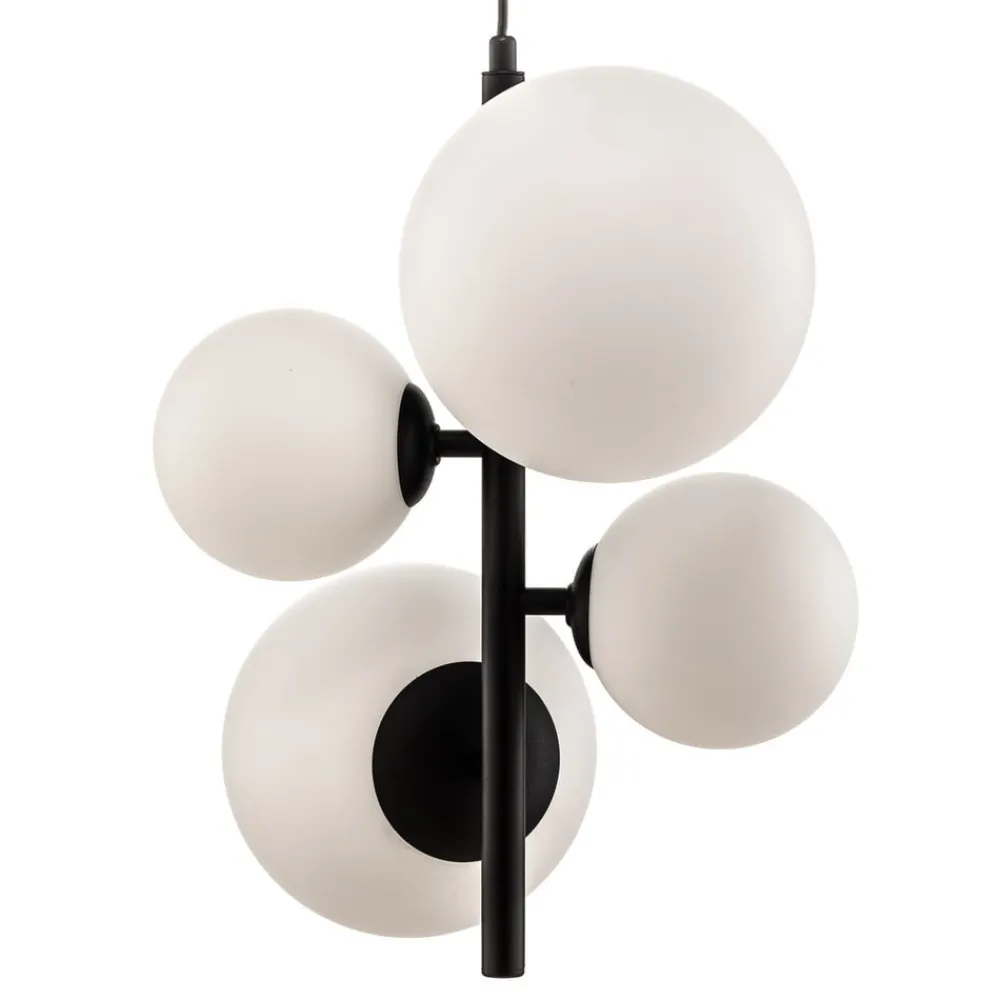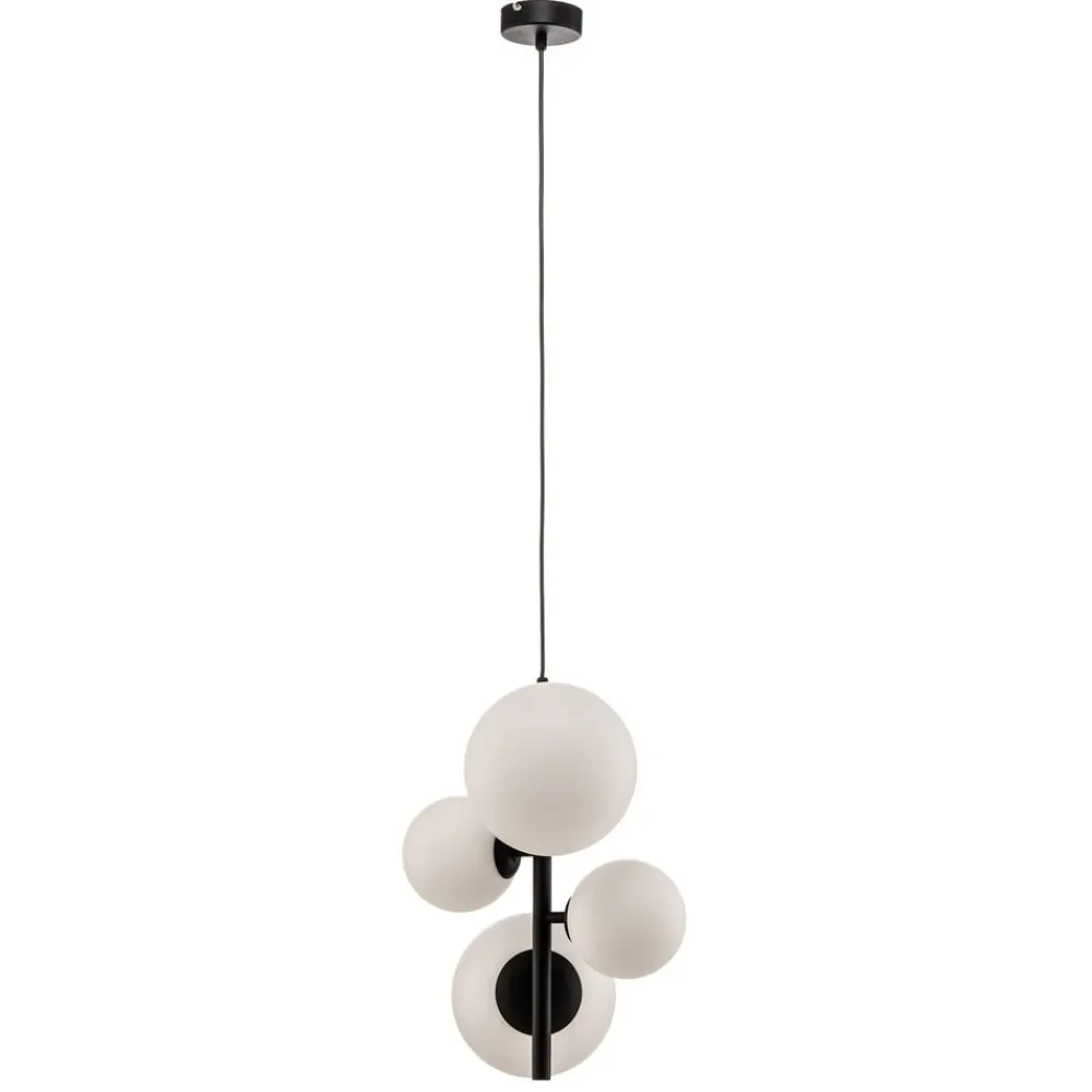 Hængelampen Dione, 4 lyskilder, sort, kombinerer moderne design med funktionel belysning og er et highlight i enhver bolig. Den er fremstillet af metal og glas i høj kvalitet og imponerer med sine klare linjer og den kontrastrige kombination af hvidt frostet og sorte elementer. Denne lampe passer perfekt ind i forskellige indretningsstilarter og er ideel til stuer, køkkener og spisestuer.