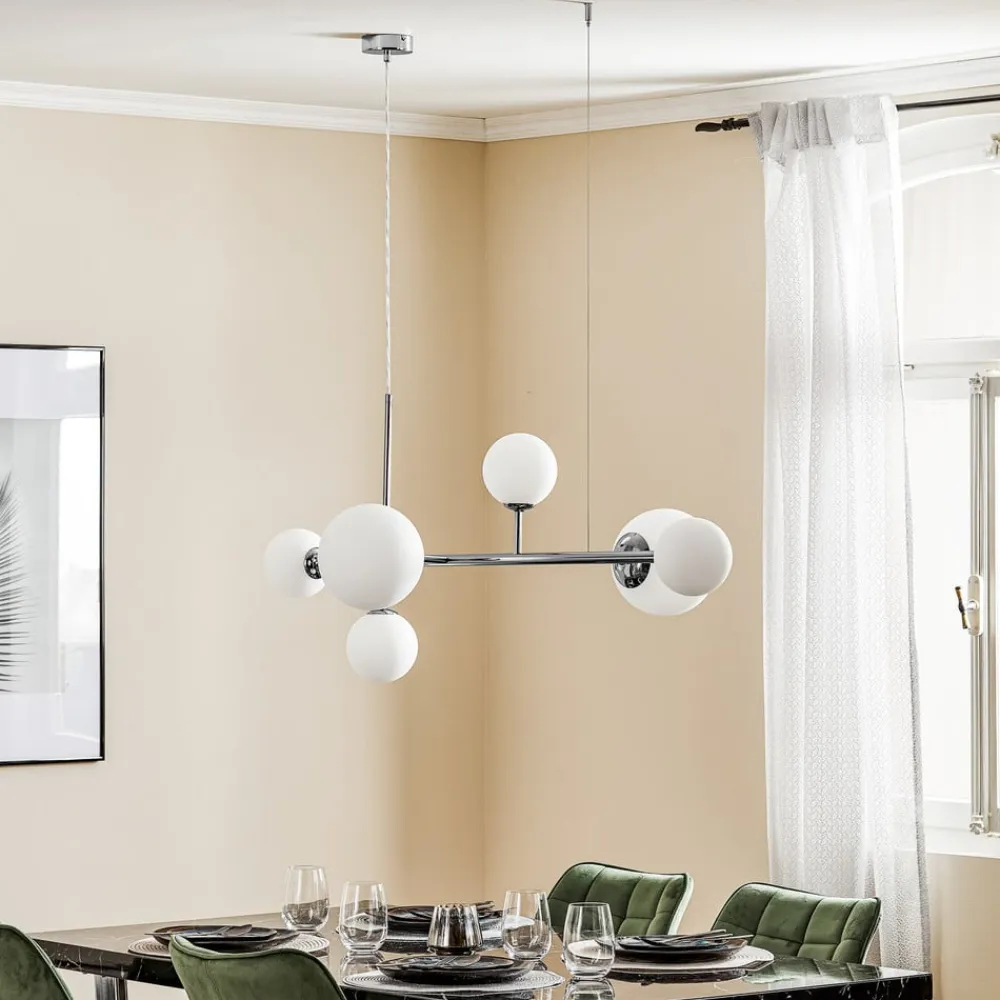 Pendellampen Dione, 6 lyskilder, krom, forener moderne design med funktionel alsidighed. Den er fremstillet af højkvalitets metal og glas og passer perfekt ind i moderne boliger som stuer, køkkener eller spisestuer. Kombinationen af hvidt frostet glas og kromfarvet finish giver lampen et elegant og samtidig diskret udtryk, der giver ethvert rum et særligt præg.