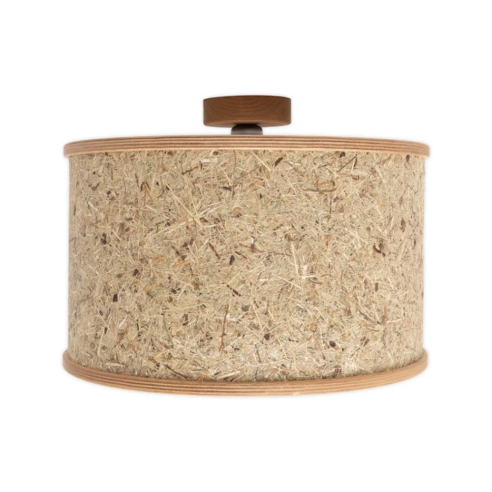 Der er kun brugt naturlige råmaterialer som hø og træ til den store loftslampe i designserien 2610. Baldakinen og rammene på den cylindriske skærm er lavet af ædelt egetræ, mens ægte presset hø pryder siden af skærmen.