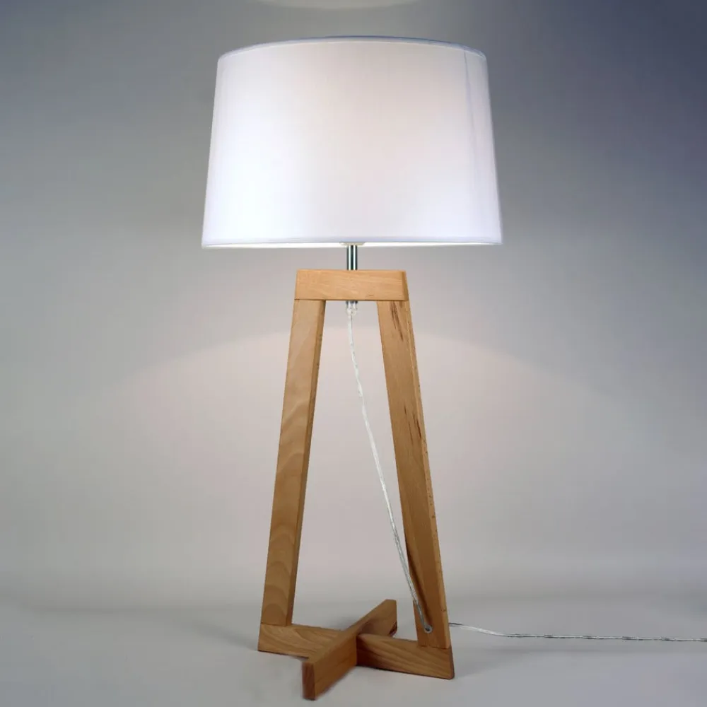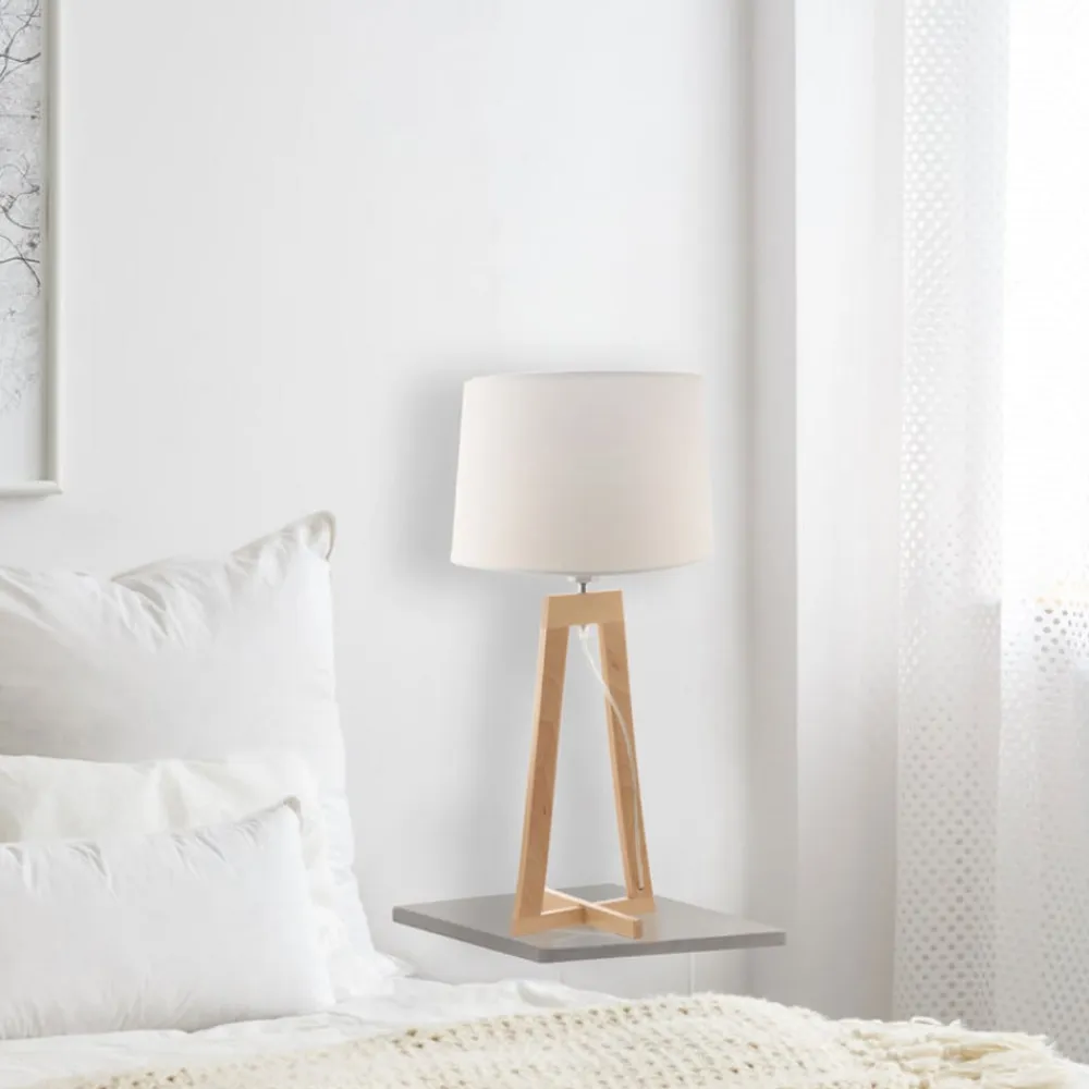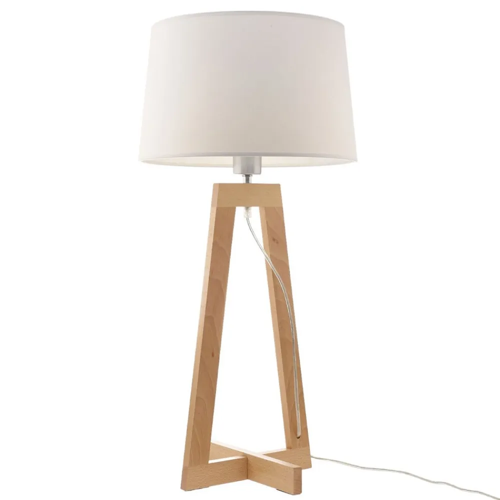 Sacha bordlampe i skandinavisk stil med træfod i korsform Denne smukke Sacha bordlampe er i den trendy skandinaviske stil. Dens formskønne fod er lavet af lyst træ og passer derfor perfekt ind i et hyggeligt, naturligt miljø. Dette suppleres af en klassisk formet lampeskærm af chintzstof. Stoffet giver en behagelig lysfordeling og skaber en hyggelig atmosfære. Sacha er velegnet som lyskilde i en stue eller alternativt i et soveværelse på en skammel. Det kommer særligt godt til sin ret, når der er andre møbler med lignende træelementer i rummet. Lampen betjenes ved hjælp af en vippekontakt på lampekablet.