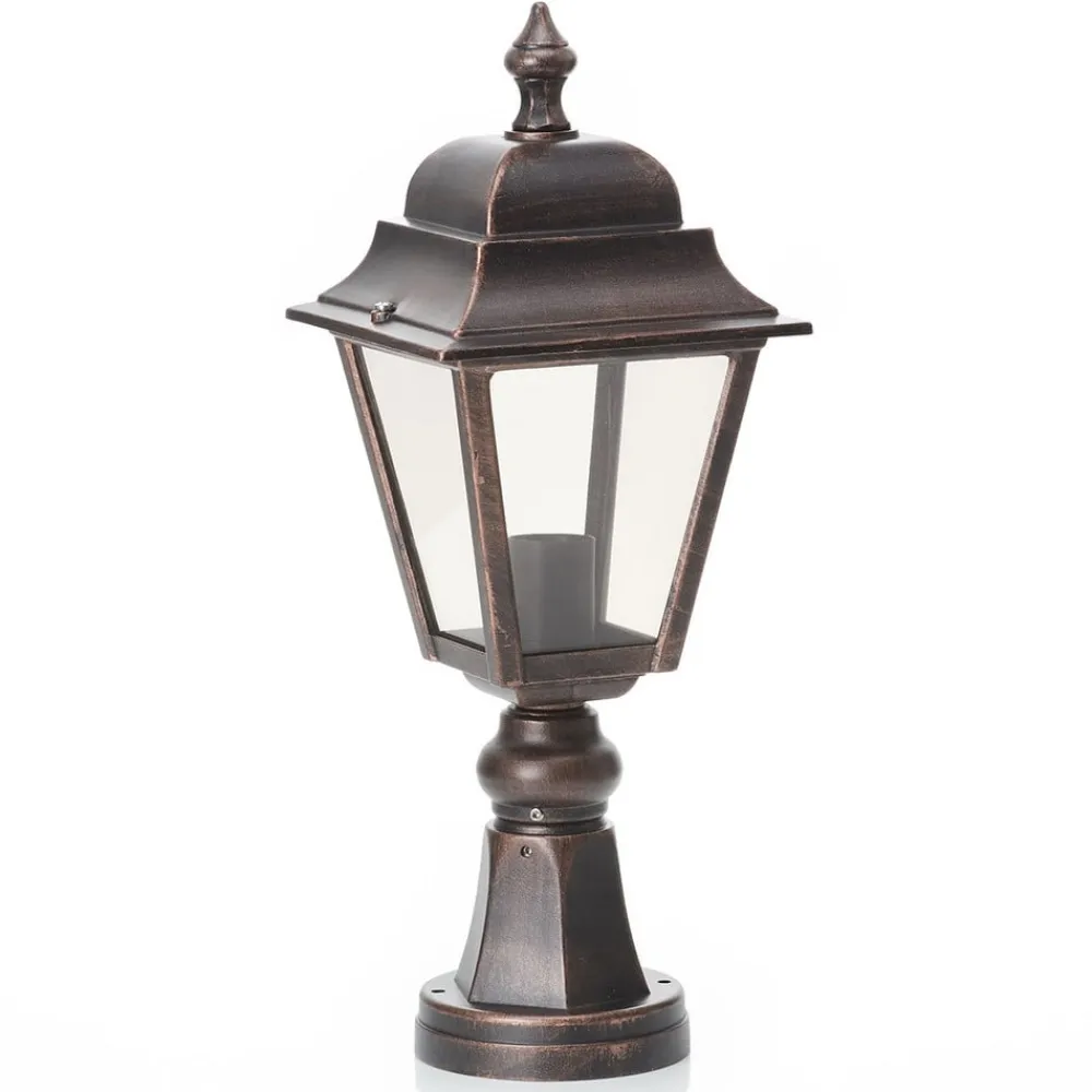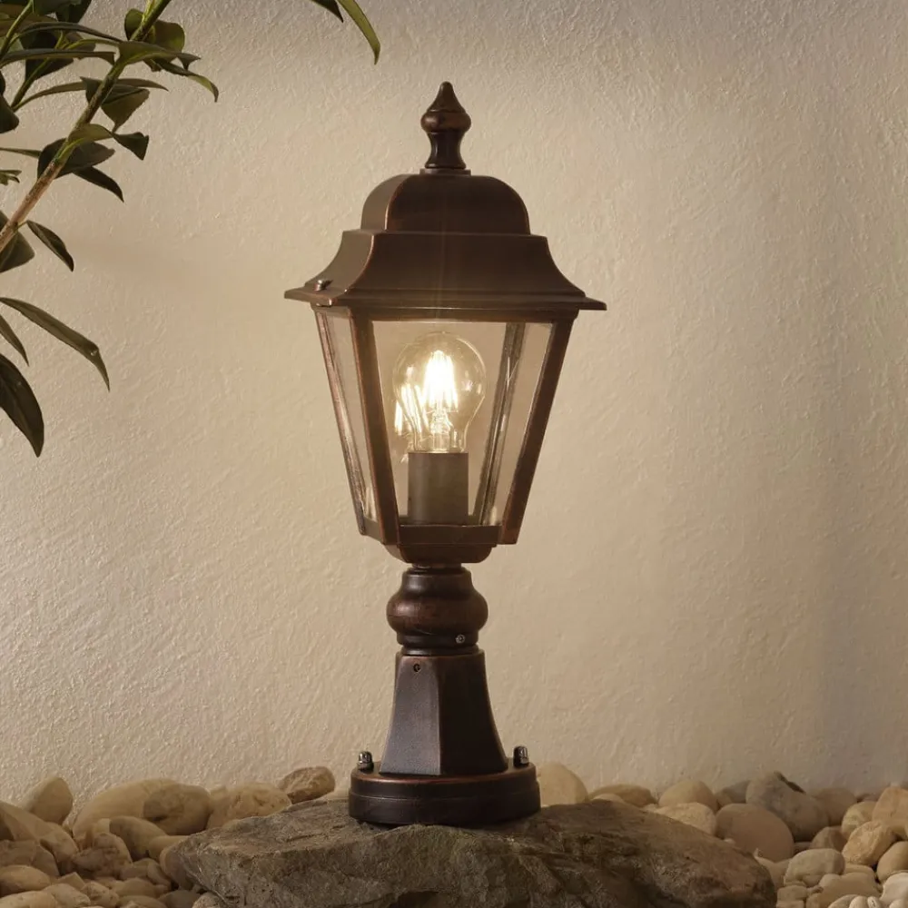 Antikt udseende Toulouse-sokkelampe Den dekorative Toulouse-sokkelampe udstråler antik charme. Den er lavet af aluminium, pulverlakeret i et antikt kobberlook og udstyret med let tonet, klart glas. IP43-beskyttelsesgraden gør den modstandsdygtig over for vind og vejr, og muligheden for at bruge energibesparende lyskilder eller LED-lamper sikrer en omkostningseffektiv belysning.