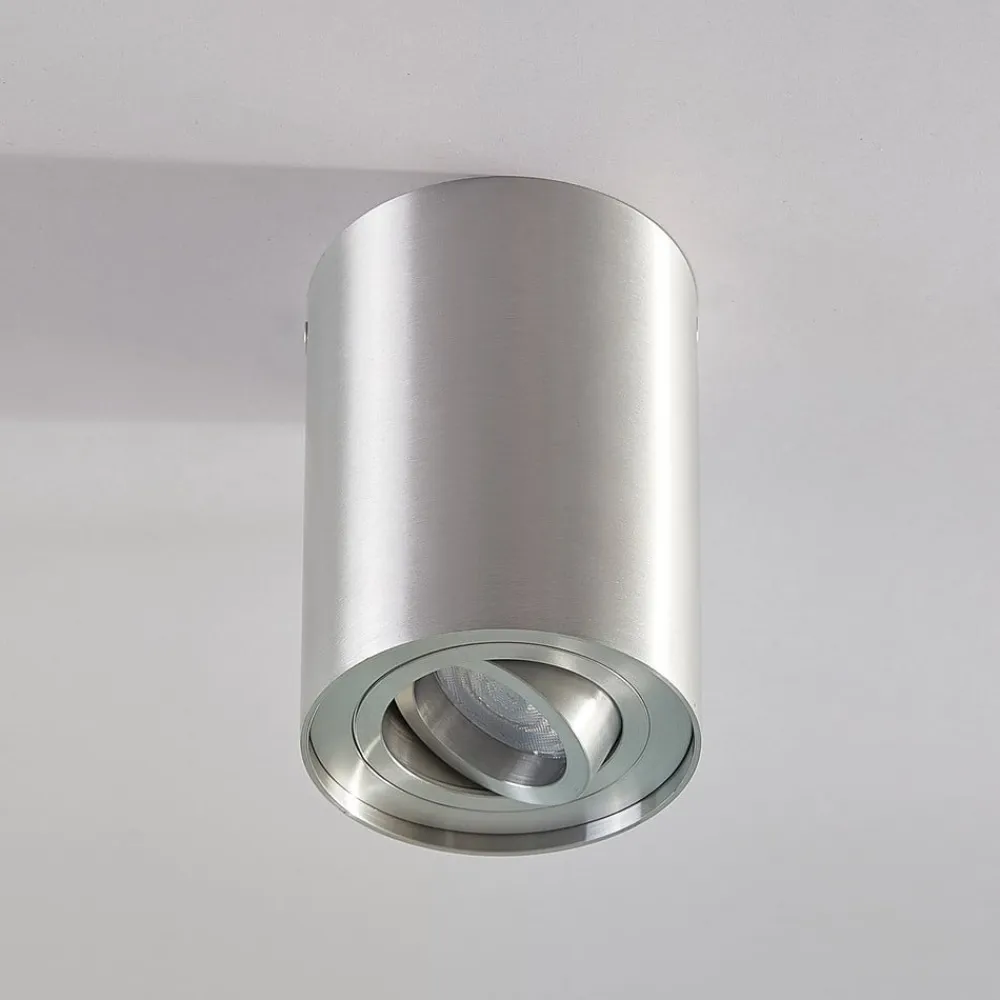 Aluminiumsfarvet loftspot Jolina i en enkel, rund form – i et praktisk sæt med 2 Jolina er en loftspot, der passer til moderne indretninger af enhver art og har et enkelt udseende som lyskilde med et funktionelt look. Loftspotten består af en rund, cylindrisk aluminiumskrop med en børstet overflade. Lyskildeindsatsen kan drejes, så den kan flyttes op til 25°, så lysretningen bedre kan justeres – med skrueløs hurtigkoblingsklemme af høj kvalitet (holdbar, sikker og værktøjsfri fjedermekanisme) – leveres i et sæt med 2 stk