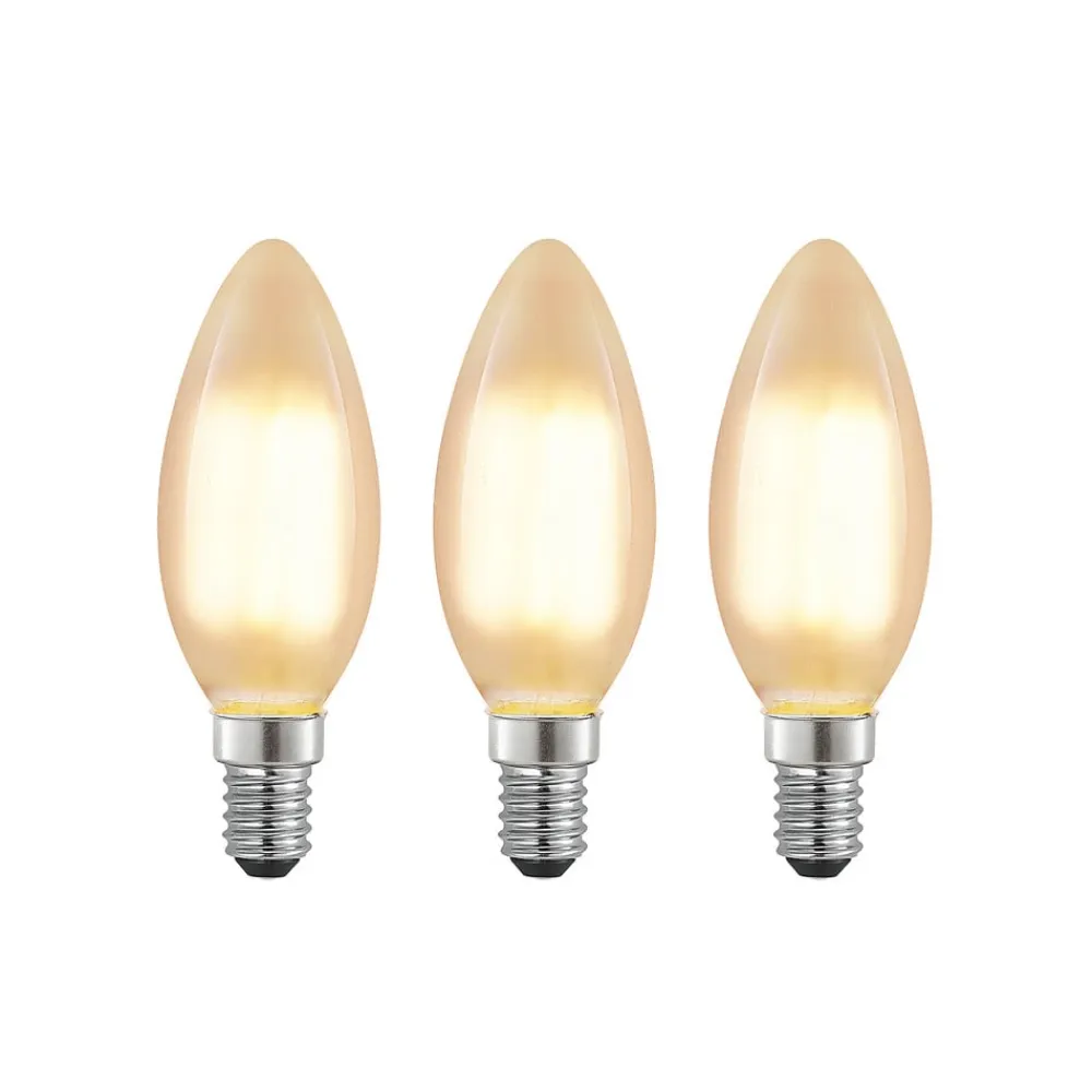 LED-kertepære E14 4W, varmhvid (2.700 K), dæmpbar, med matteret glas i sæt med 3 Denne LED-pære giver en god belysning, som er blændfri takket være det matterede glas. Dens effekt svarer til en traditionel glødepære på 40W, selvom LED-teknologien er mere økonomisk med hensyn til forbrug. Lampens lysstyrke kan justeres ved hjælp af en standard vægdæmper – Dæmpbar med bagkantstyret dæmper – Leveres i et praktisk sæt med 3 stk