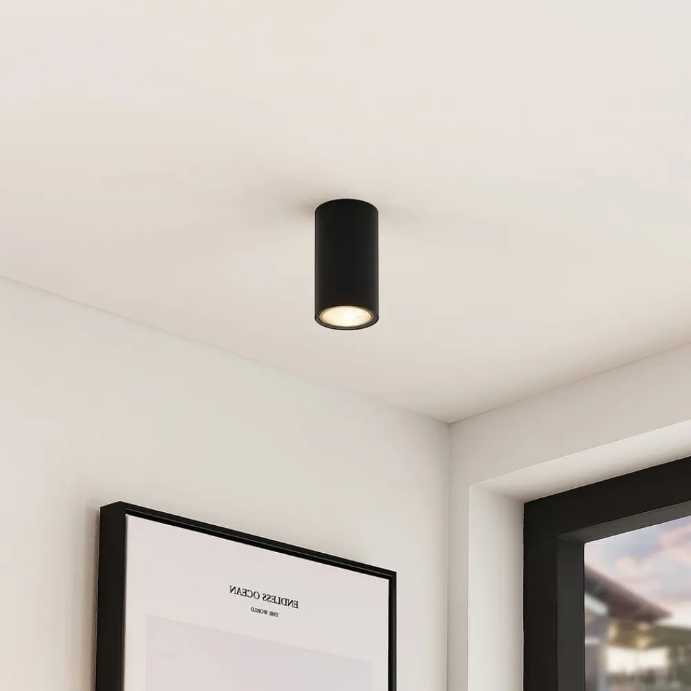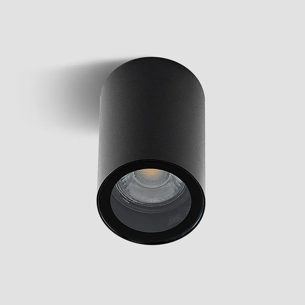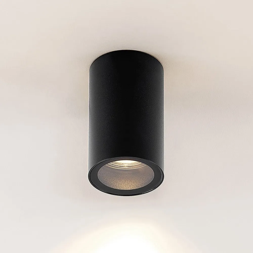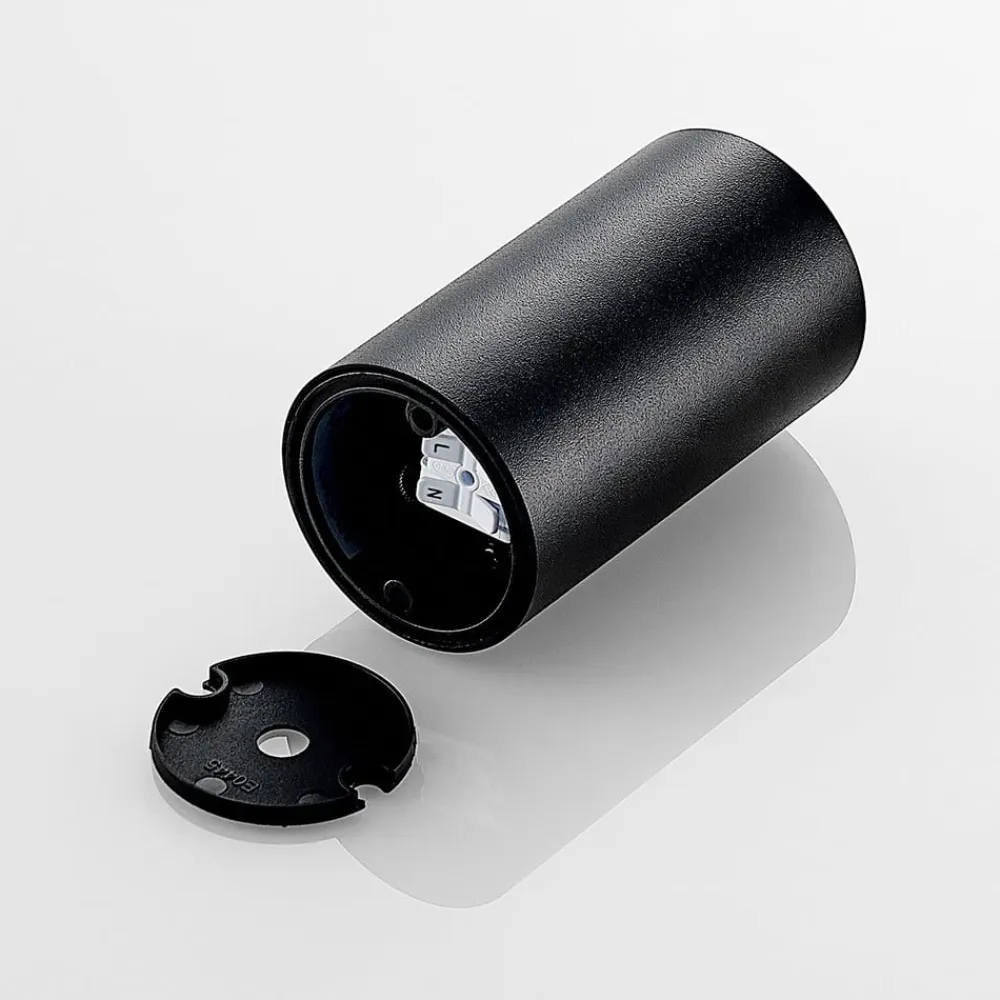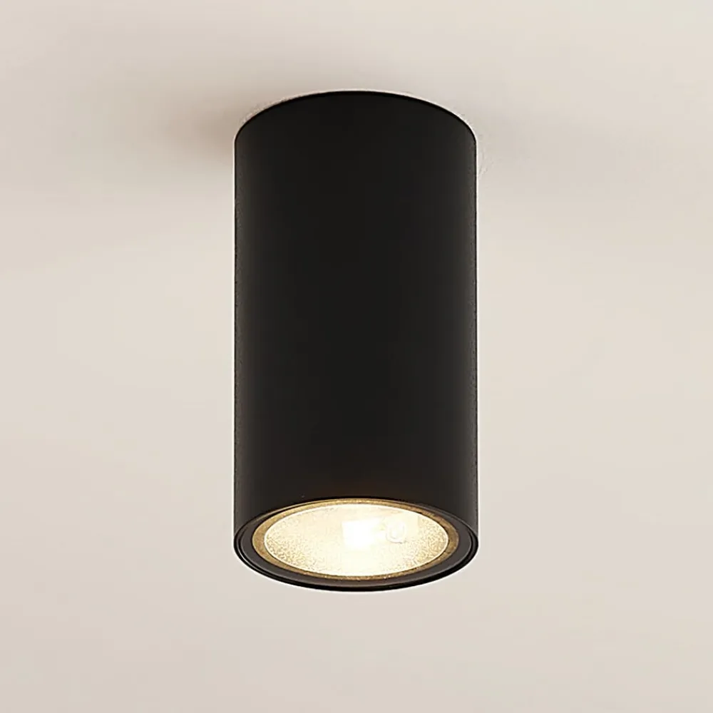 Cylindrisk GU10 downlight Olivir i matsort lakeret aluminium, med ekstra reflektorpære i guld Olivir har et matsort armaturhus i aluminium, som har en enkel rund form og kan bruges på mange forskellige måder. Downlight’ens lampeskærm ser derfor ret moderne ud, men spotlighter også noget tidløst. For at skabe mere individualitet i lysdesign og udseende er downlighten udstyret med to udskiftelige reflektorpærer, hvoraf den ene er sort som huset, og den anden har en gylden finish for at skabe en effektiv kontrast.