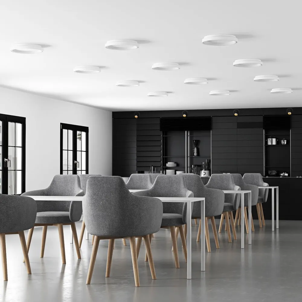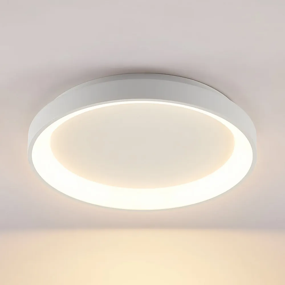 Rund, hvid LED-loftlampe Vivy med god lysstyrke Vivy kan bestemt ses som en nyfortolkning af en klassisk køkkenlampe, hvilket primært skyldes dens runde form og ringformede lysudsendelse. Loftlampen er dog særligt effektiv i forhold til tidligere lamper og giver et stærkt lys, selv om strømforbruget er relativt lavt. Det er fordele, som altid er velkomne i både private og kommercielle miljøer. Designet med den runde form og den hvide overflade ser enkelt og moderne ud – en tiltalende LED-loftlampe til mange formål!