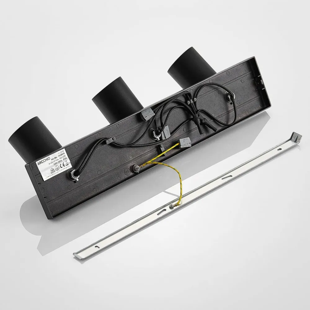 Den sorte lampe Brinja i højkvalitetsaluminium består af tre cylindriske spotlight, som alle kan vippes 90 grader og drejes 350 grader. Spotlight sidder på en rektangulær holder, som kan monteres både på loftet og på væggene.