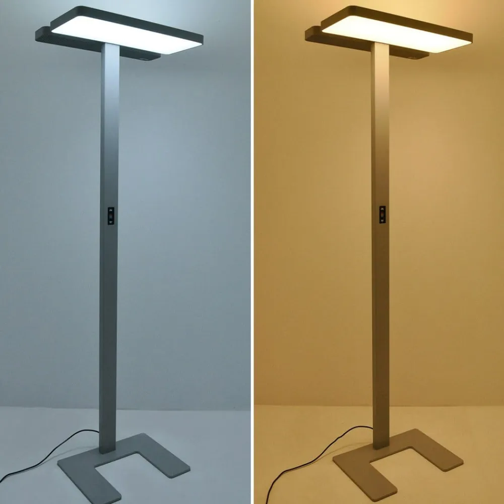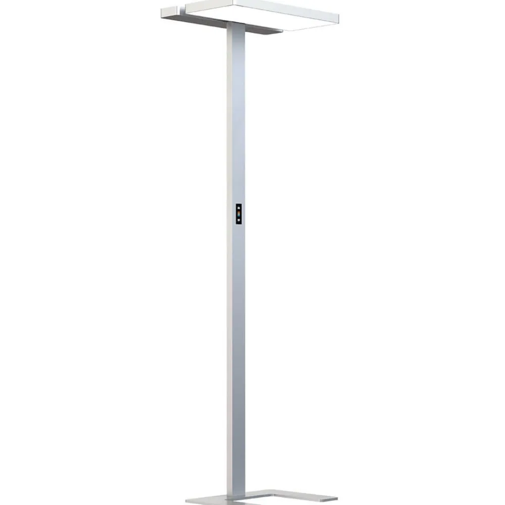 Sølvfarvet LED-gulvlampe Aila til brug på kontoret – med dæmper, bevægelsessensor, dagslyssensor og justerbar lysfarve Dette er en ægte allrounder til belysning af et kontor, da LED-gulvlampen integrerer forskellige funktioner og egenskaber. Lyset sendes opad og nedad og giver en kombination af direkte og indirekte lys, som opfattes som særligt behageligt for øjnene. Med sin U-formede fod kan LED-gulvlampen til kontor også placeres, hvor bordben kunne komme i vejen, og forhindrer derfor ikke optimal belysning af arbejdspladsen. Dagslyssensoren styrer lysstyrken afhængigt af lysforholdene i rummet, så lysstyrken opleves så konstant som muligt, hvilket forbrugerne finder aflastende og giver dem mulighed for at koncentrere sig om deres arbejde i længere tid. Lyset kan også dæmpes manuelt. Hvis arbejdspladsen forlades, og der ikke er nogen til stede i et bestemt tidsrum, sørger bevægelsessensoren for, at lyset slukkes automatisk, indtil nogen igen tager plads for at arbejde videre. Et andet ægte HighLight: LED-gulvlampen har ikke en fast lysfarve, men kan justeres i området fra 3.000 Kelvin til 6.000 Kelvin, afhængigt af situationen og personens personlige præferencer på arbejdspladsen. Det gør det muligt at opnå en varmhvid, universalhvid eller dagslys hvid farvetemperatur. Lyset er flimmerfrit – UGR < 16 – malet sølv (RAL 9006)