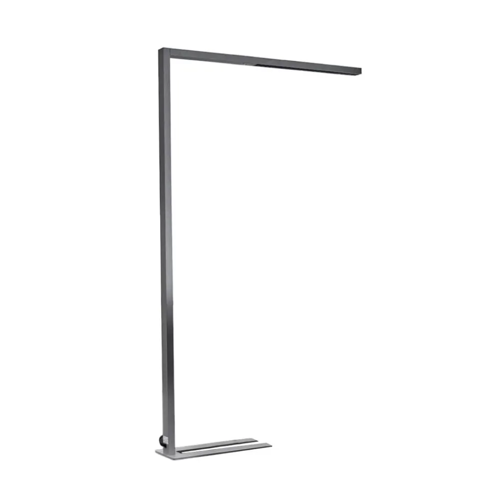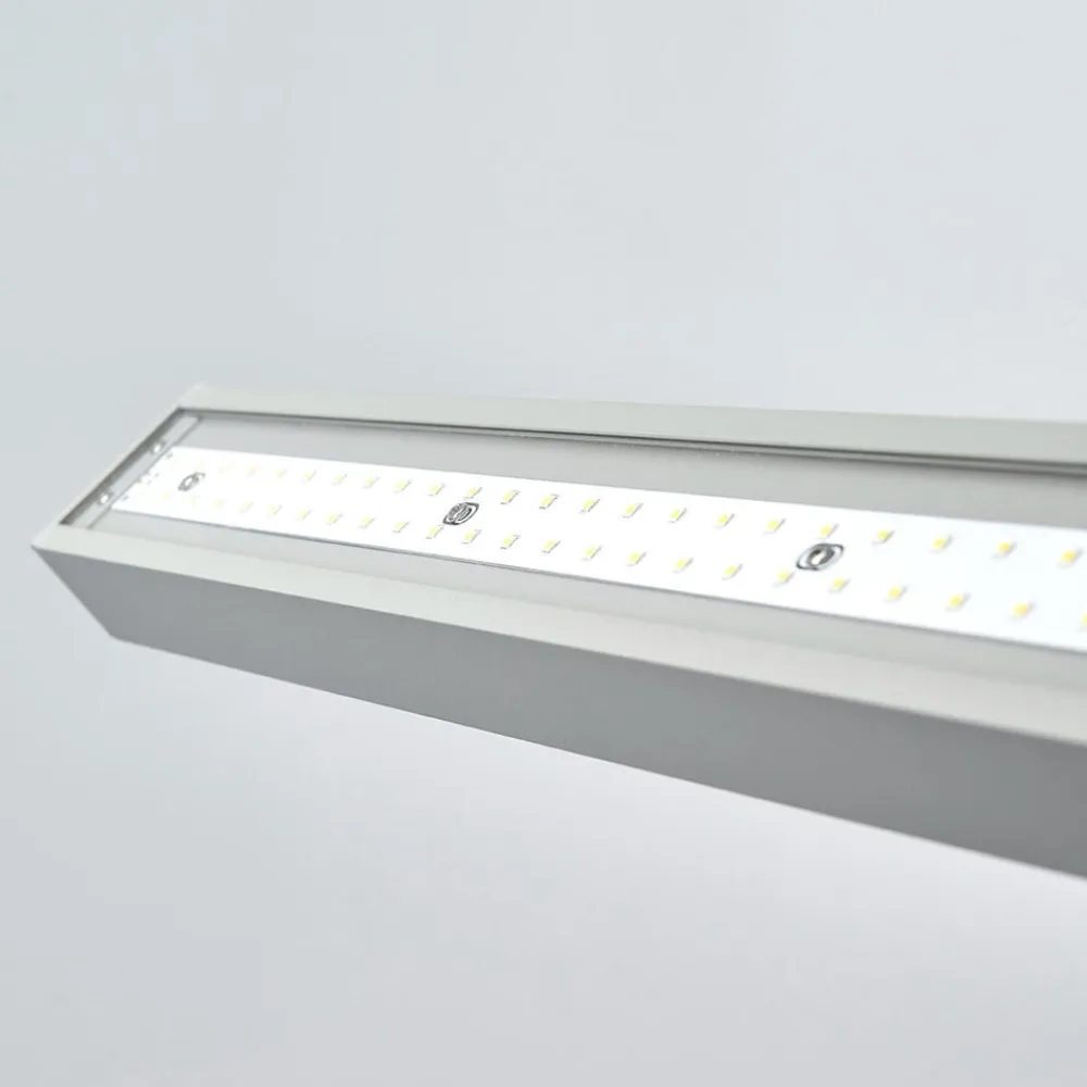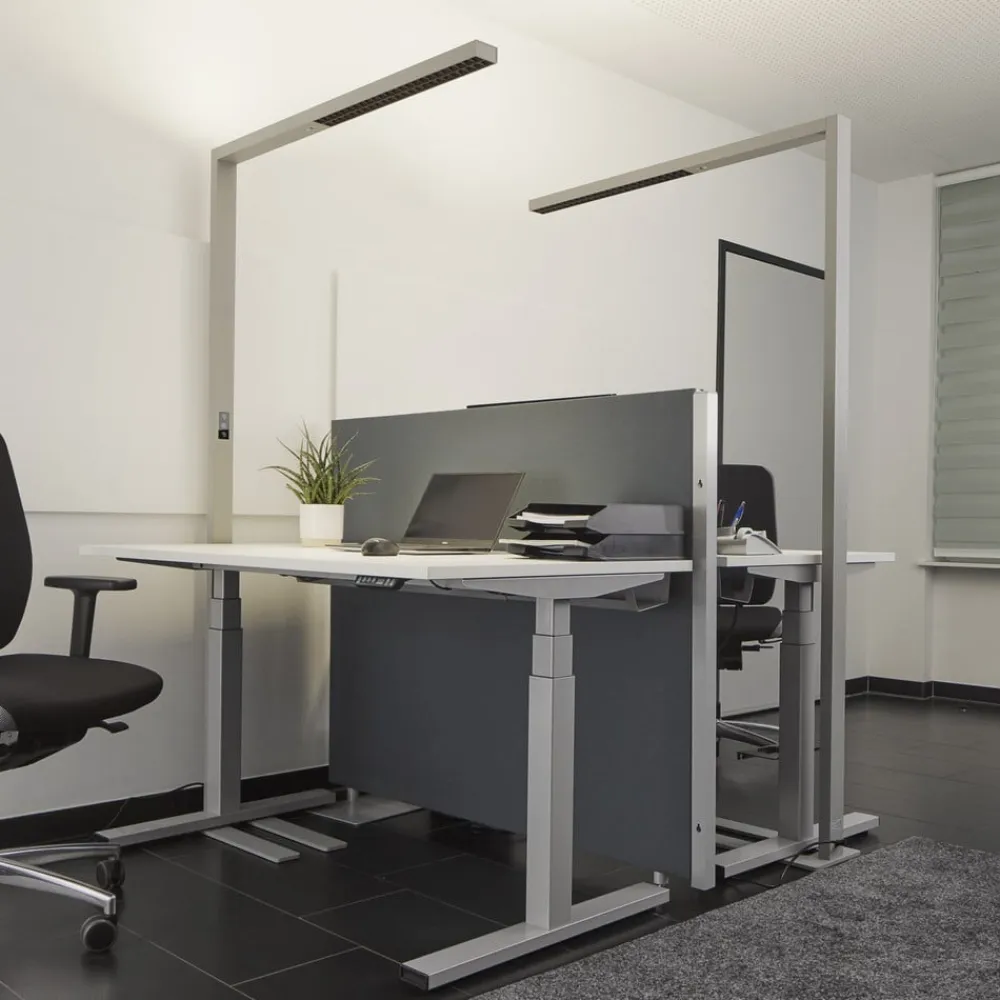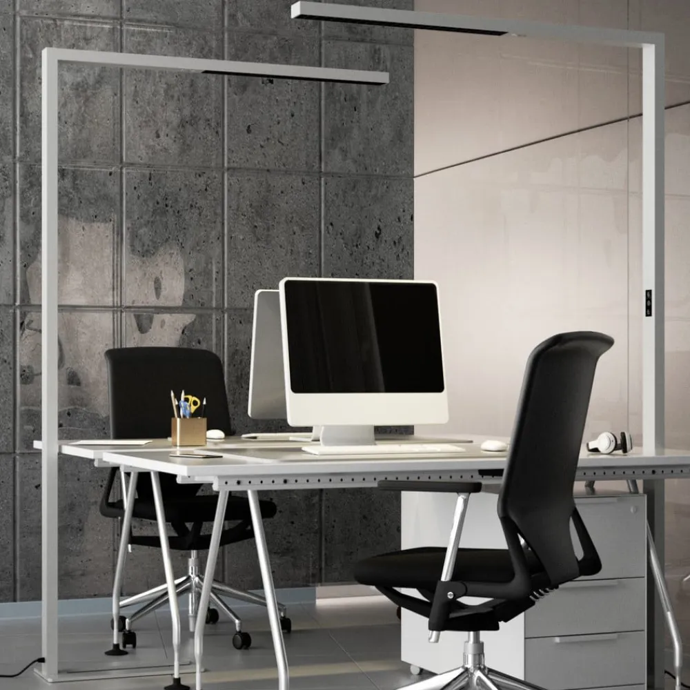 Funktionel LED-gulvlampe til kontor Jolinda med dagslyssensor, bevægelsessensor, dæmper og direkte/indirekte belysning Jolinda har et minimalistisk, meget moderne udseende, da gulvlampen stort set kun består af to smalle bjælker, der er placeret i rette vinkler i forhold til hinanden. Lyset skinner opad og nedad, stort set uden at blænde nedad, hvilket giver en meget behagelig lysoplevelse, som er perfekt til lange perioder med koncentreret arbejde ved skrivebordet. LED-gulvlampen er velegnet til at oplyse et skrivebord, som så forsynes med stærkt lys. Det høje funktionsniveau skal også nævnes, da Jolinda ikke kun har en dæmpningsfunktion, men også styres via en dagslyssensor og en bevægelsessensor. Efter 30 minutters fravær slukker armaturet af sig selv, og dagslyssensoren sikrer en relativt konstant lysstyrke i rummet, fordi lyset fra LED-gulvlampen bliver lysere eller mørkere afhængigt af lysstyrken udenfor – med U-formet fod – UGR < 6 Armaturerne er optimeret til at give en ideel, blændfri og ensartet belysning til et standardskrivebord på 160 cm x 80 cm. Det anbefales derfor at bruge én lampe pr. skrivebord.