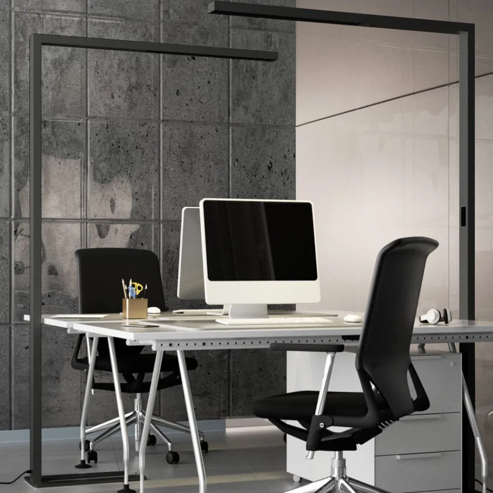 Funktionel LED-gulvlampe til kontor Jolinda med dagslyssensor, bevægelsessensor, dæmper og direkte/indirekte belysning Jolinda har et minimalistisk, meget moderne udseende, da gulvlampen stort set kun består af to smalle bjælker, der er placeret i rette vinkler i forhold til hinanden. Lyset skinner opad og nedad, stort set uden at blænde nedad, hvilket giver en meget behagelig lysoplevelse, som er perfekt til lange perioder med koncentreret arbejde ved skrivebordet. LED-gulvlampen er velegnet til at oplyse et skrivebord, som så forsynes med stærkt lys. Det høje niveau af funktionalitet bør også nævnes, da Jolinda ikke kun har en dæmpningsfunktion, men også styres via en dagslyssensor og en bevægelsessensor. Efter 30 minutters fravær slukker armaturet af sig selv, og dagslyssensoren sikrer en relativt konstant lysstyrke i rummet, fordi lyset fra LED-gulvlampen bliver lysere eller mørkere afhængigt af lysstyrken udenfor – med U-formet fod – UGR < 6 Armaturerne er optimeret til at give en ideel, blændfri og ensartet belysning til et standardskrivebord på 160 cm x 80 cm. Det anbefales derfor at bruge én lampe pr. skrivebord.