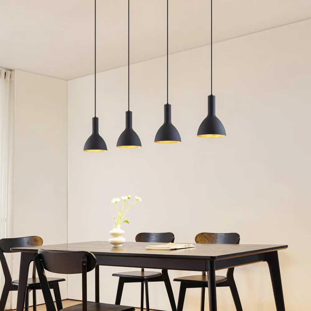 Hængelampe til spisestuen med 4 lyskilder, Cosmina, med metalskærme i sort og guld