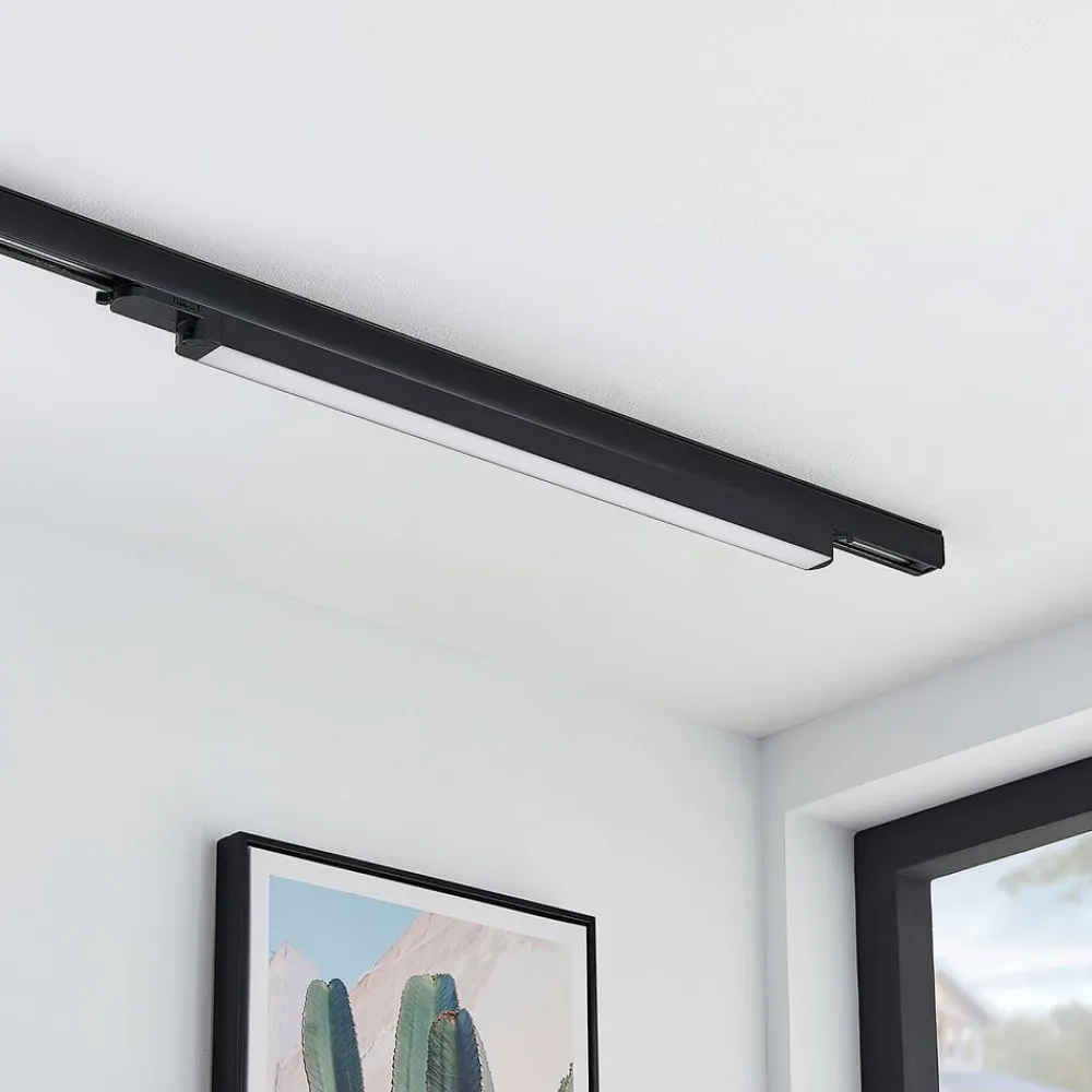 Sort Harlow LED lineært armatur til montering på et skinnesystem Harlow er en lyskilde, der giver god belysning med sin aflange form. Takket være LED-teknologien kan man sikre en god lysstyrke med et lavt strømforbrug, og LED’erne bag den hvide plastikafskærmning giver en så ensartet belysning som muligt og dermed et behageligt lys. ALS skinnesystemarmatur er Harlow en lyskilde, der kan bruges på mange forskellige måder, og som også kan kombineres med alternative lyskilder på 3-fase skinnen. Det er ikke kun rum i private lejligheder og huse, der egner sig til at bruge LED-skinnesystemet, det er også altid en nyttig tilføjelse i kommercielle eller offentlige bygninger, når det drejer sig om at skabe et sofistikeret, tilpasset belysningskoncept. Visuelt holder armaturet på skinnesystemet sig diskret i baggrunden og scorer point med en moderne overflade i sort – til brug på 3-fase skinne – SDCM < 4 – UGR 29.3