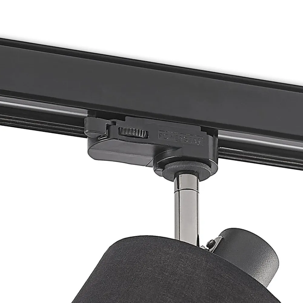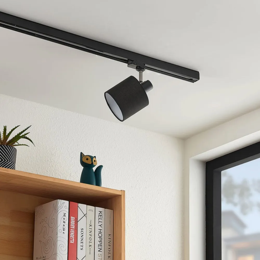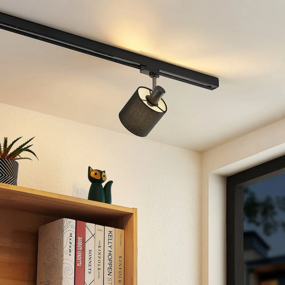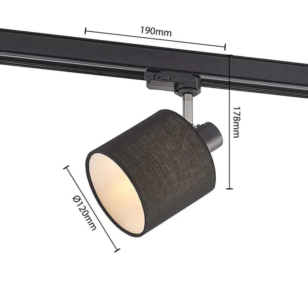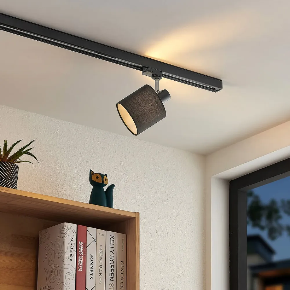 Sandsort spot Heleni lavet af tekstil – kan integreres i et skinnesystem Heleni imponerer med sit enkle og moderigtige design. Spottet er lavet af tekstil og har en cylindrisk form. For at afrunde designet har den en sandsort farve. Passende pærer kan indsættes i dens indre – deres lys dæmpes af skærmvæggene og fordeles i rummet på en målrettet måde. Heleni kan nemt integreres i et skinnesystem og kan kombineres med andre armaturer i serien efter behov. Armaturets hyggelige tekstildesign ser godt ud i en stue eller et soveværelse.