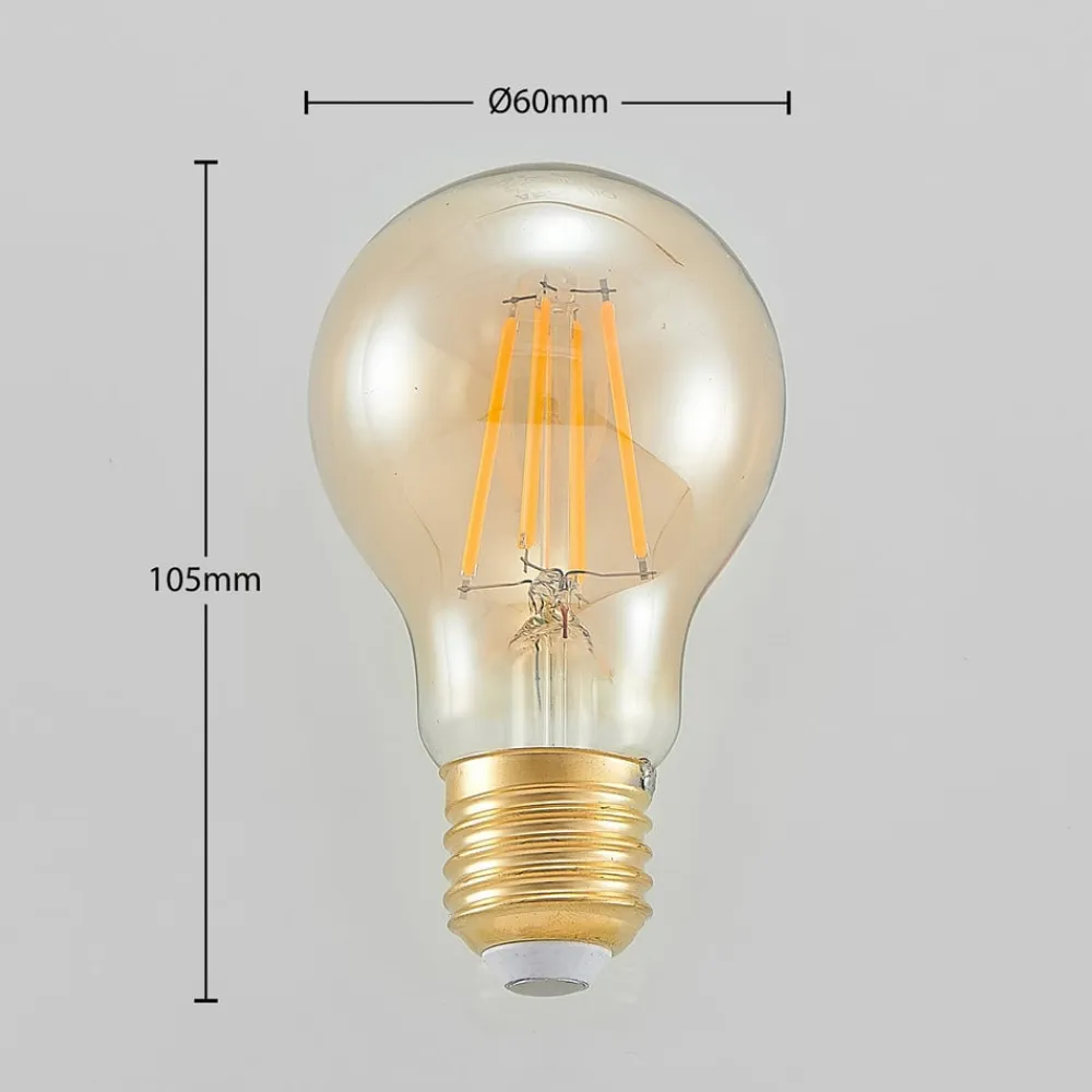 Amber-tinted LED lampe E27 glødetråd 6,5W, tre-niveau dæmpbar i et sæt af 3Denne E27 LED lampe er et rigtig godt valg til alle armaturer, hvor lyskilden er synlig. LED-glødelamperne med glødetråd bag ravfarvet glas kan skiftes i tre lysstyrker via den eksisterende lysafbryder uden ekstra lysdæmper (100%, 55%, 20%).- Lampen leveres i et praktisk sæt med 3 stk