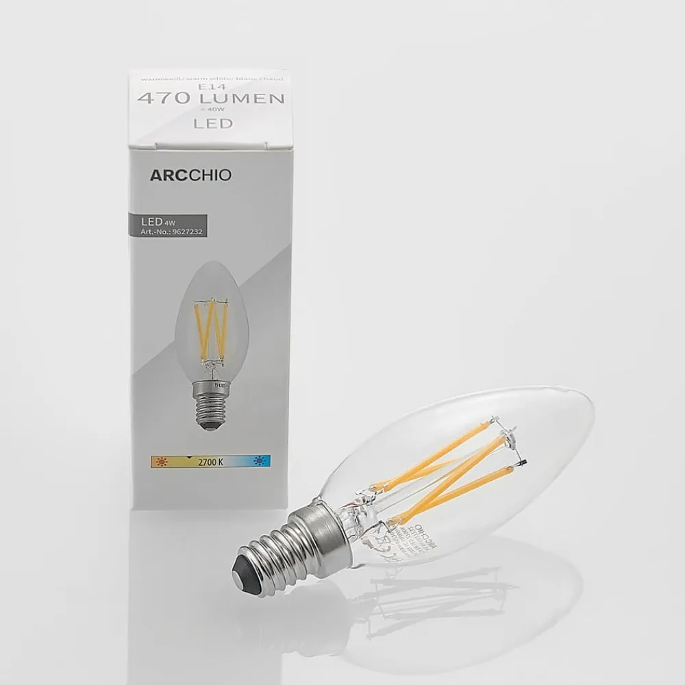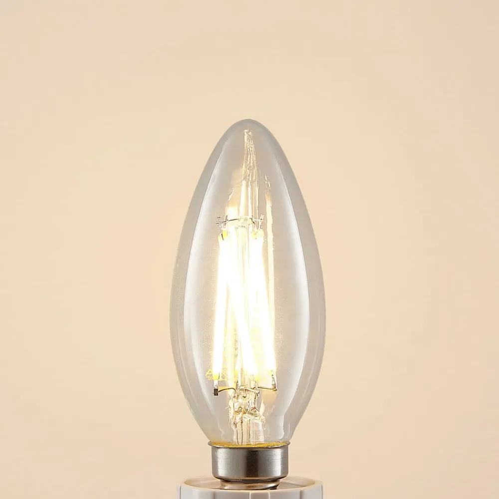 Denne LED-pære har form som et stearinlys og et trendy glødetrådsdesign. Dens lysstyrke svarer til en 40 W traditionel glødepære, men LED-teknologien er særligt energibesparende. Lampens lysstyrke kan justeres med en almindelig vægdimmer.