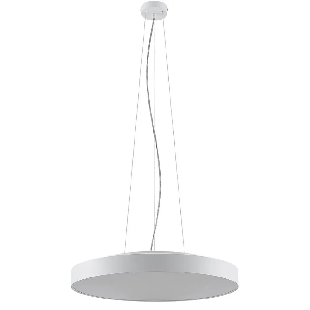 Rund LED-pendellampe Vanida i hvid – perfekt som køkkenbelysning Designet på Vanida LED-pendellampe er enkelt og moderne, men ekstremt stilfuldt, så det er altid en god anbefaling at vælge denne pendellampe, når det gælder belysning af opholds- og spiseområder. Lyset sendes hovedsageligt nedad, men også opad i mindre grad. Det får lyset i omgivelserne til at fremstå mere naturligt og ensartet. LED’erne har også en god lysstyrke og et lavt forbrug, hvilket betyder, at de er meget effektive i overensstemmelse med moderne krav. LED-pendellampen hænger ned fra loftet i slanke ledninger, som sammen med den hvide finish giver den et udtryk af lethed – ja, armaturet ser næsten ud til at svæve.