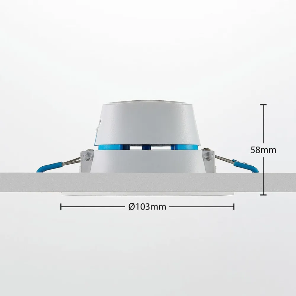 Rund LED-indbygningslampe Milaine med hvid plastramme og lysfarve, der kan justeres før installation Milaine er en alsidig LED-indbygningslampe med mange fordele. Det runde design med den hvide overflade virker utroligt enkelt og kan bruges næsten overalt. Dette diskrete indbygningsspot kan bruges i både kommercielle og private miljøer og kan endda bruges i fugtige rum takket være kapslingsgraden IP44. Lysfarven kan indstilles til et af tre niveauer, før den indbygges i loftet, da der er en DIP-kontakt på indbygningslampens hus. Med en strålevinkel på 100° spredes lyset ret bredt, så Milaine også kan bruges til at oplyse et større område. Der er praktisk mulighed for gennemfortrådning til tilslutning af flere armaturer af denne type – SDCM <; 5 – UGR <; 25 – armaturet leveres i et praktisk sæt med 3 stk