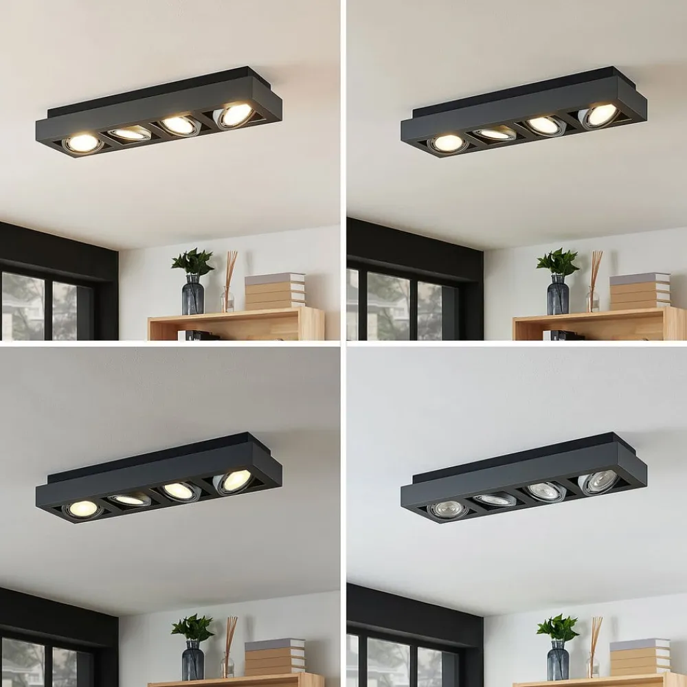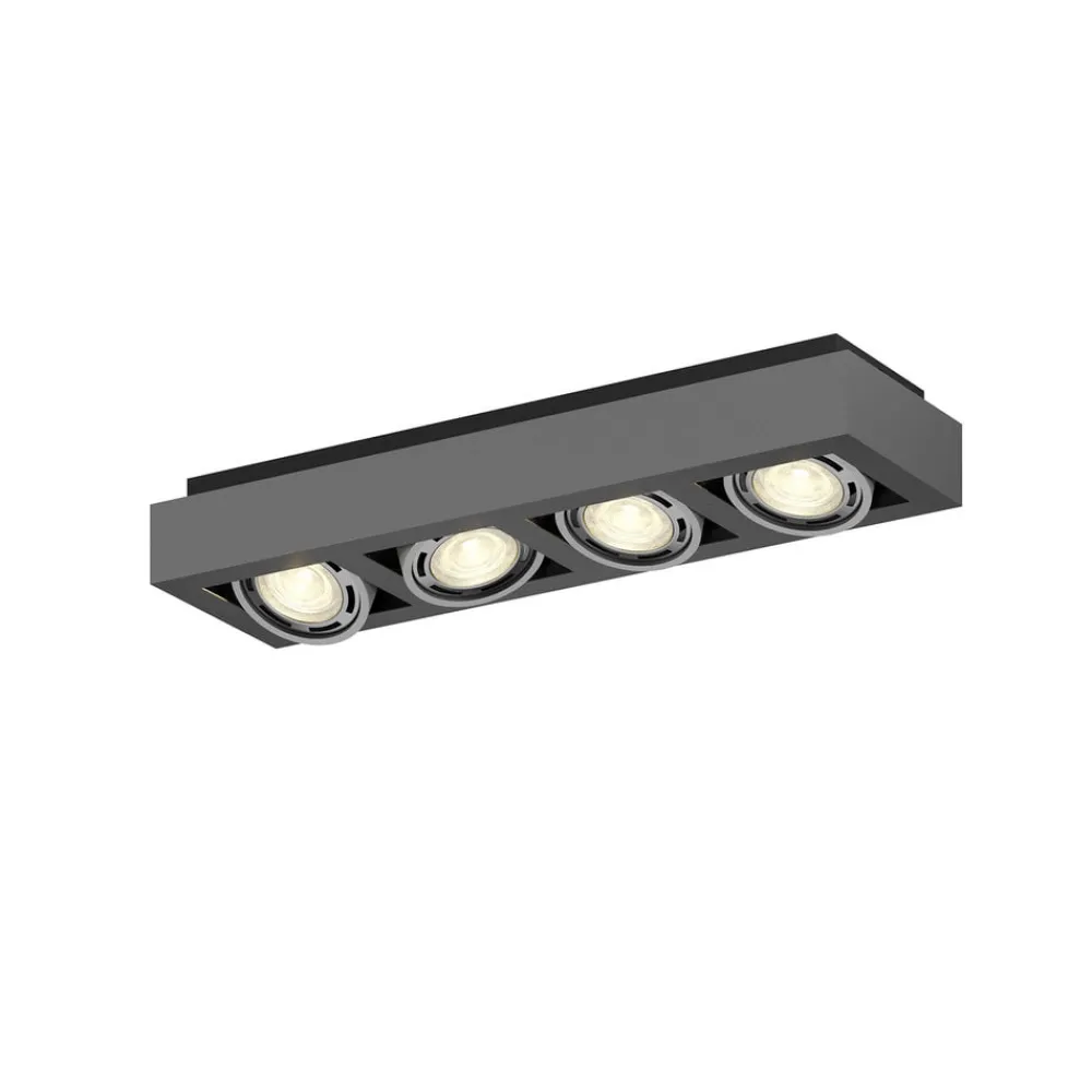 Langstrakt Ronka loftspot med mørkegrå finish – ideel som butiksbelysning Indsatsen med GU10-fatning, som der her er monteret fire af, kan drejes efter behov, så lyset kan justeres efter behov. Det gør loftlampen ideel til brug i den kommercielle sektor, hvor Ronka f.eks. kan bruges som belysning i en velassorteret butik. Den professionelle brug af loftspottet understøttes også af den skrueløse tilslutningsklemme, som gør det muligt at tilslutte kablerne hurtigt, sikkert og uden brug af værktøj. Aluminiumshusets mørkegrå overflade er noget, der er diskret og tidløst. Armaturet kan derfor bruges i mange forskellige indretninger uden at se malplaceret ud.