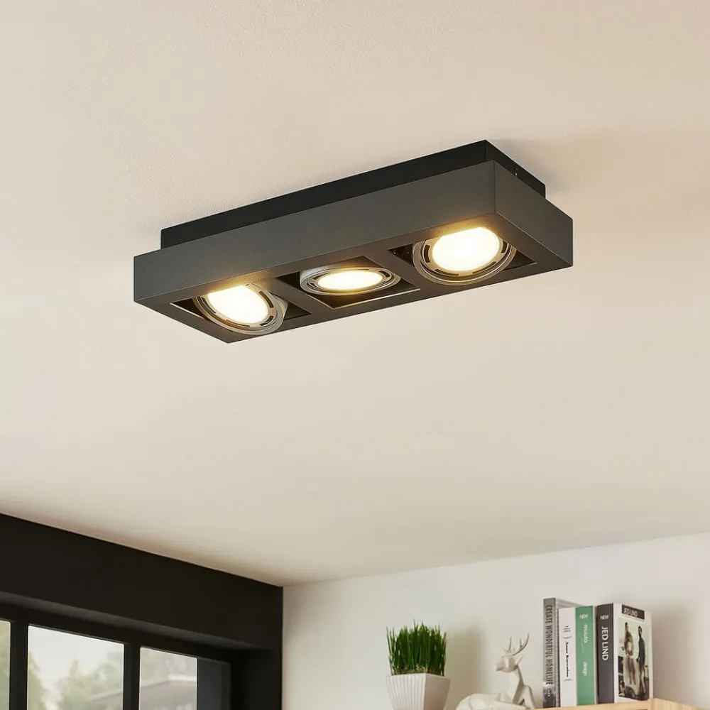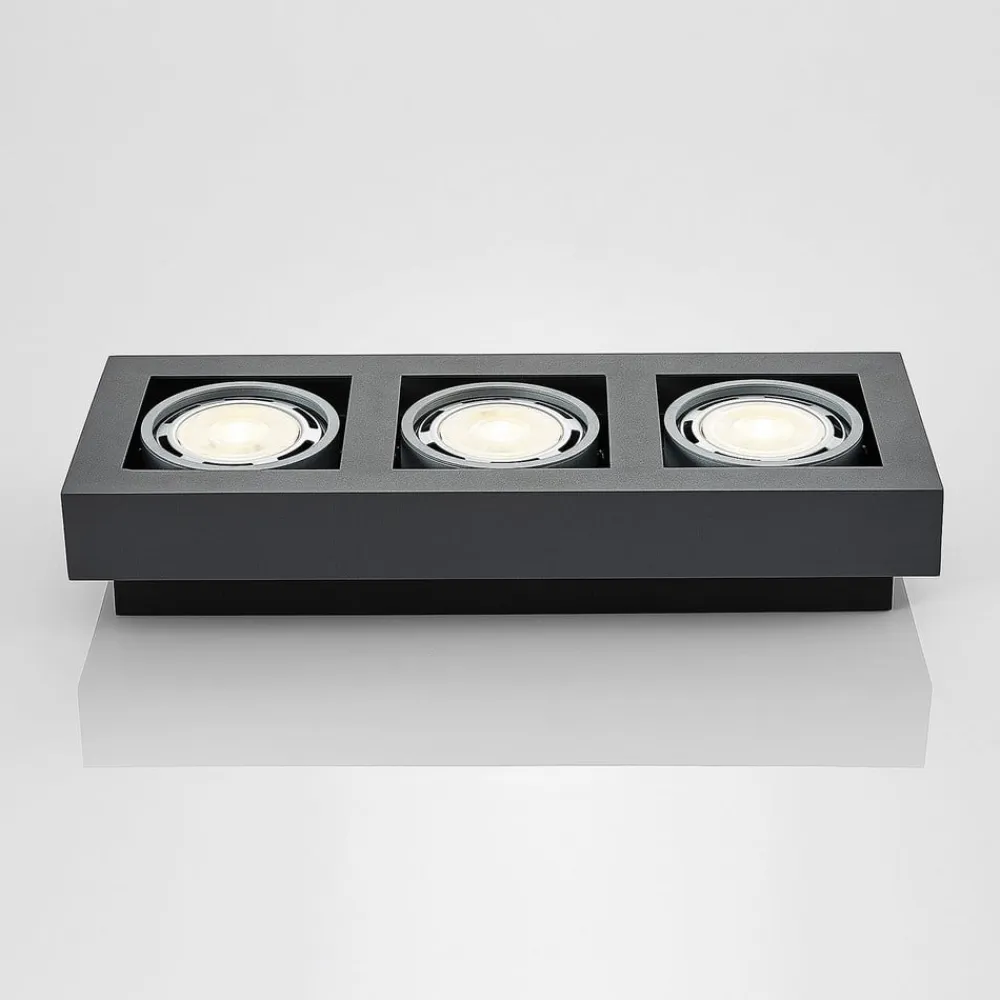 Mørkegrå Ronka loftlampe til tre dæmpbare LED-loftlamper Ronka er velegnet til både private ejendomme og erhvervslokaler og er en loftlampe, der skaber et klart lys og kan bruges godt som hovedbelysning. De tre indsatser i det mørkegrå, kantede hus kan nemt drejes, hvilket betyder, at lysmønstret bedre kan justeres. Passende GU10-lysstofrør kan købes separat via tilbehøret. Den skrueløse tilslutningsklemme er meget nyttig til tilslutning, så kablerne kan tilsluttes hurtigt, sikkert og uden brug af værktøj. Loftspottens design er både moderne og diskret og er frem for alt funktionelt. Lampen kan derfor nemt kombineres med forskellige stilarter – til GU10-pærer med ES111-design (maks. 20 W)