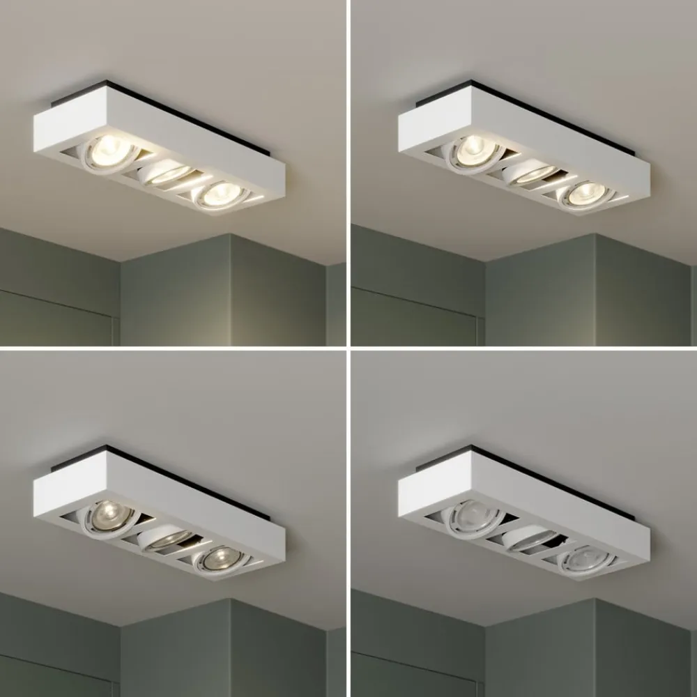 Ronka hvid loftlampe til GU10-lamper De tre indsatser i dette loftspot kan alle drejes og udstyres med kraftige, energibesparende GU10-lamper. I versionen med 3 lyskilder giver loftlampen et meget klart lys, hvilket gør denne hvide loftlampe ideel til stemningsbelysning i rummet. Den er også velegnet til brug i et kommercielt miljø, f.eks. som butiksbelysning. Desuden er den indbyggede tilslutningsklemme skrueløs, så enkelte, fine og flertrådede ledere kan tilsluttes hurtigt og sikkert uden brug af værktøj. Ronka loftlampen har et diskret, funktionelt udseende, der passer fint ind i baggrunden og kan bruges på mange forskellige måder.