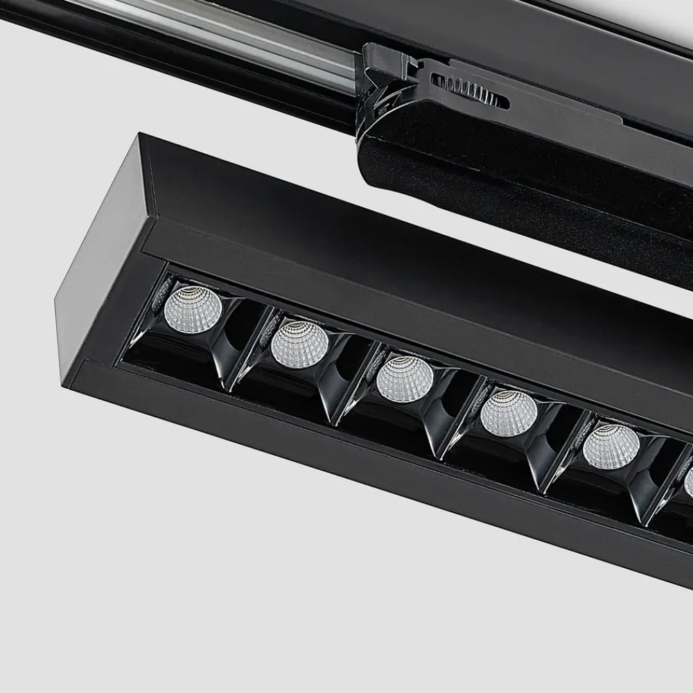 Sort, drejelig Millay LED-skinnespotlight med blændfrit, flimmerfrit lys, UGR < 15 Millay er et LED-spotlight designet til brug med et 3-faset skinnesystem. Armaturet er ideelt til brug i et kommercielt miljø, f.eks. som butiksbelysning eller på et kontor, fordi spotlightet har mange fordele at byde på. Den giver et blændfrit og derfor meget behageligt lys, belysningen er også flimmerfri, og spotlighten kan drejes, så lyset kan justeres individuelt og tilpasses kravene på stedet. Både den sorte overflade og det overordnede design virker meget moderne. Lyset er stærkt og effektivt takket være moderne LED-teknologi – til 3-faset skinne – flimmerfri – blændfri – UGR < 15 – SDCM < 4 – drejelig