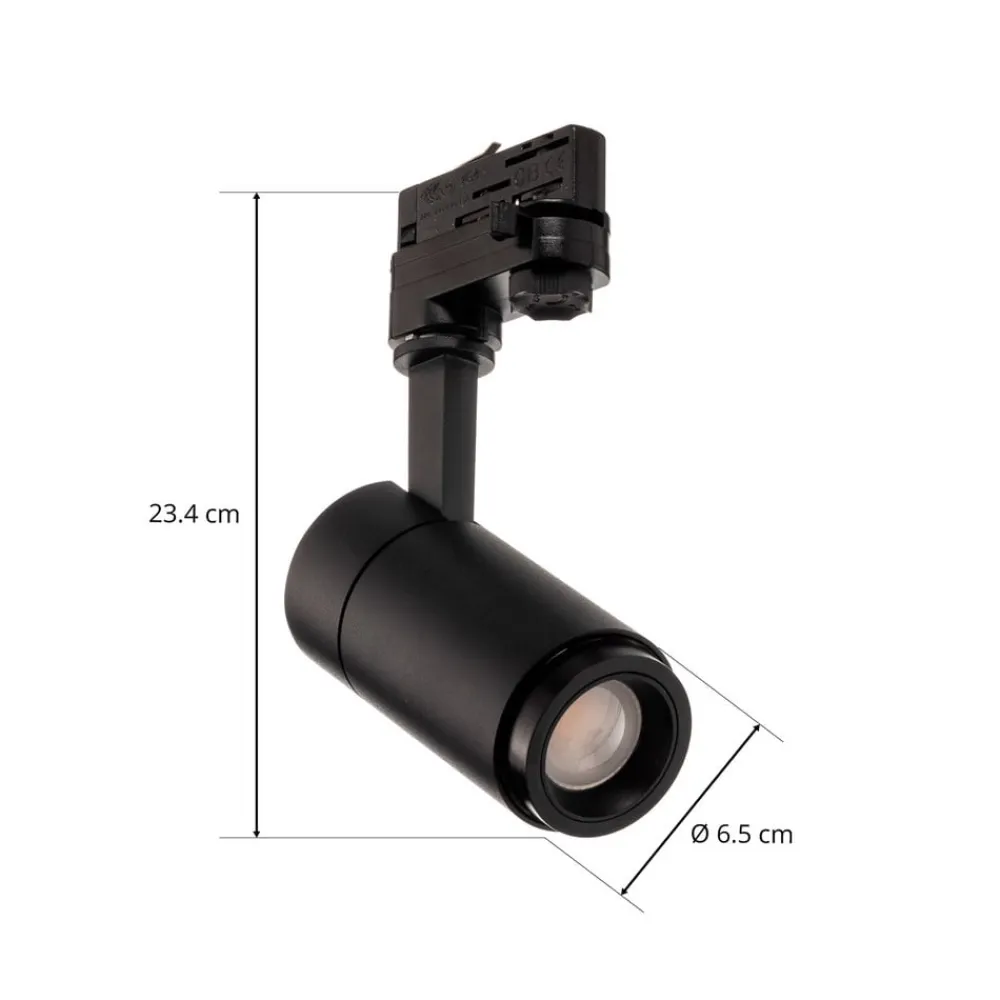 Sort Nanna LED-skinnespot – justerbar udstrålingsvinkel, til 3-faset skinne, drejelig og svingbar Denne skinnespot er kompatibel med almindelige 3-fasede skinnesystemer og kan bruges både privat og kommercielt. Den cylindriske skærm har et aluminiumshus i sort og en indvendig linse, hvis lysudstrålingsvinkel kan justeres fra 15°, hvilket er ret smalt og spotlight-agtigt for at skabe spotformet lys, op til 60°, hvilket svarer til en bredere lysudstråling for at belyse et lidt større område. Der er små markeringer på spotlighten til korrekt indstilling af vinkel, og spotlighten er meget velegnet til professionel belysning af kommercielle rum, hvor de variable justeringsmuligheder kan bruges til at skabe en tilpasset belysningssituation, især fordi selve spotlighten også kan drejes og svinges.