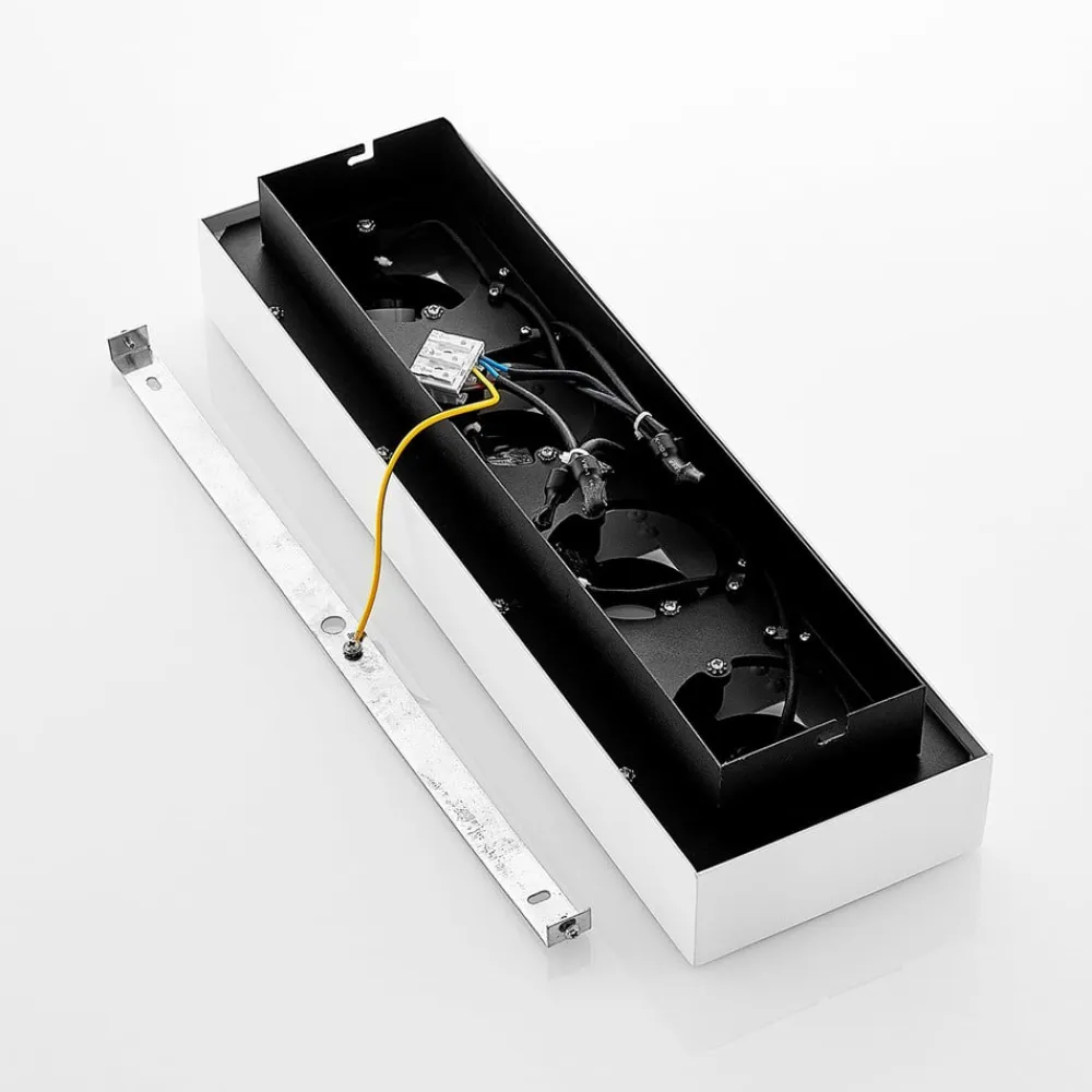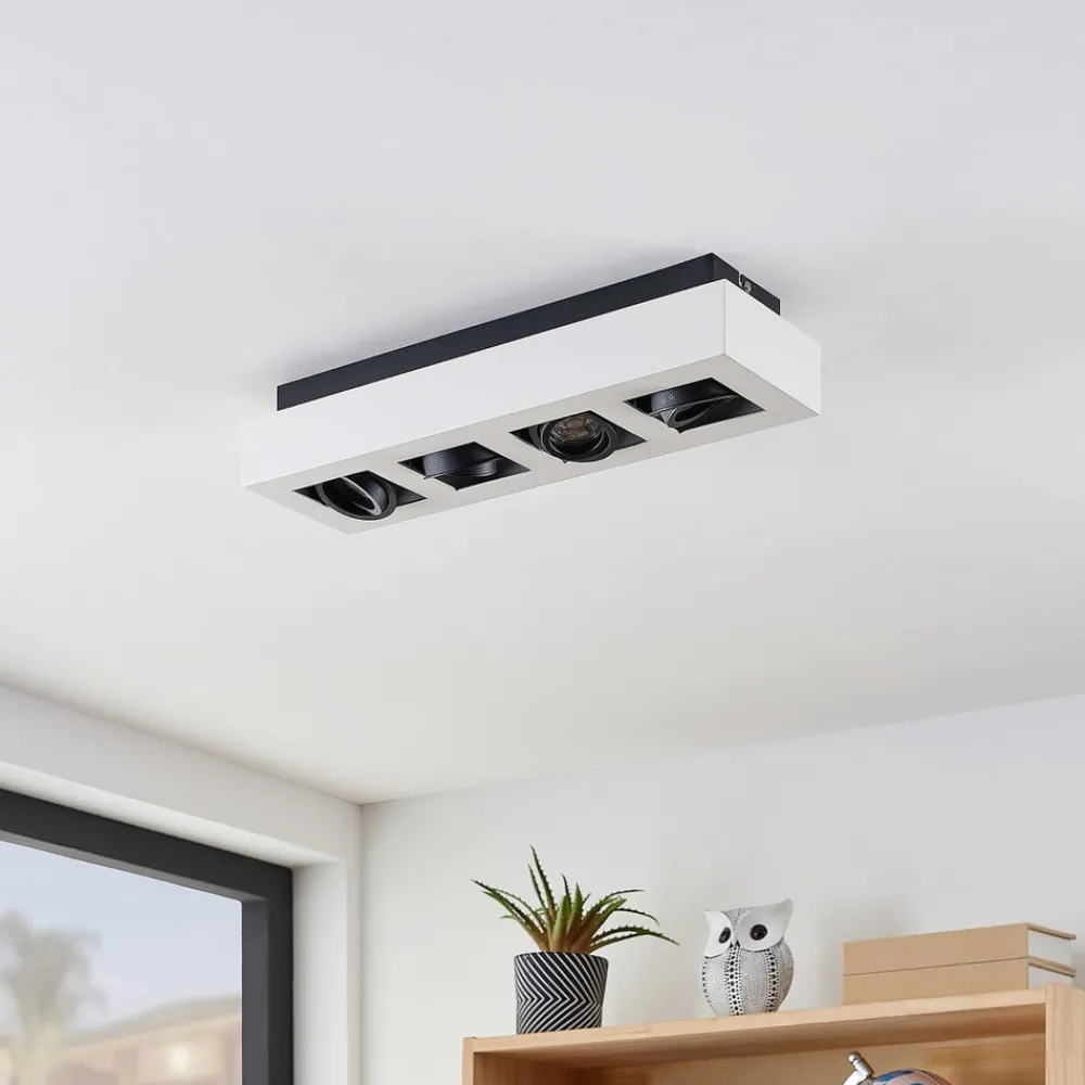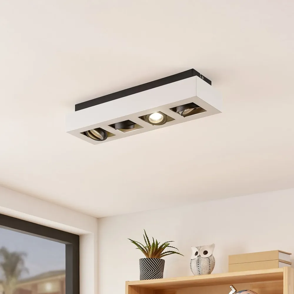Aflang Vince-loftlampe med fleksible lyskilder Den lige Vince LED-loftlampe imponerer over hele linjen med sit funktionelle design og enkle look i hvid, som passer ind i næsten ethvert interiør. De fire GU10-lyskilder er arrangeret i en række og spotlighter direkte nedad uden at blænde. Alternativt kan lysretningen justeres, så den passer til individuelle behov, da spotlightenes hældningsvinkel kan justeres fleksibelt. Dette armatur er også ideelt til kommercielle formål, da det kan fremhæve visse objekter på en stilfuld og energibesparende måde. Det er særligt effektivt, når det kombineres med andre lamper fra samme serie – med skrueløs hurtigkoblingsklemme af høj kvalitet (holdbar, sikker og værktøjsfri fjedermekanisme)