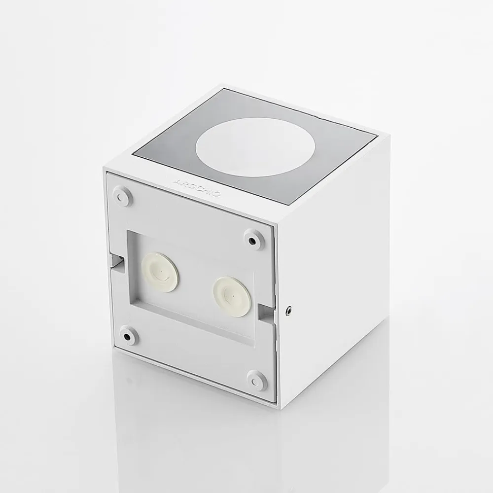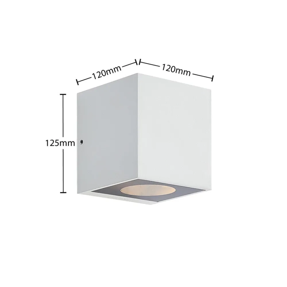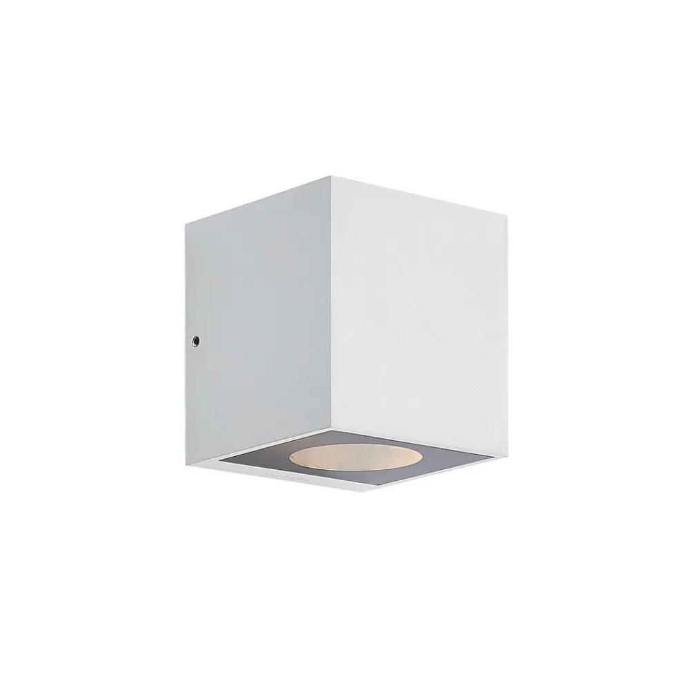 Hvid udendørs væglampe Tassnim af aluminium i kubeform Den udendørs væglampe Tassnim imponerer med sit moderne og symmetriske design. Den er fremstillet af hvid aluminium, og armaturets ydre minder om en terning. Med den rigtige lyskilde får du en pålidelig belysning af terrassen eller indkørslen. IP65-beskyttelsesgraden gør lampen beviseligt støv- og vandtæt. Disse egenskaber gør Tassnim udendørs væglampe perfekt til udendørs områder og trodser vejrforholdene udenfor. Dens enkle udseende gør den også perfekt til brug på ydervægge uden at overskygge resten af den arkitektoniske stil.