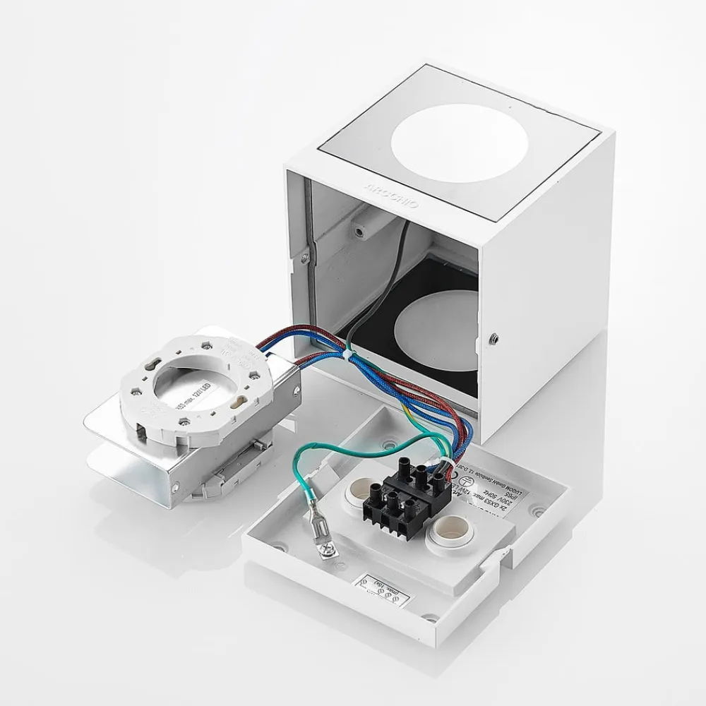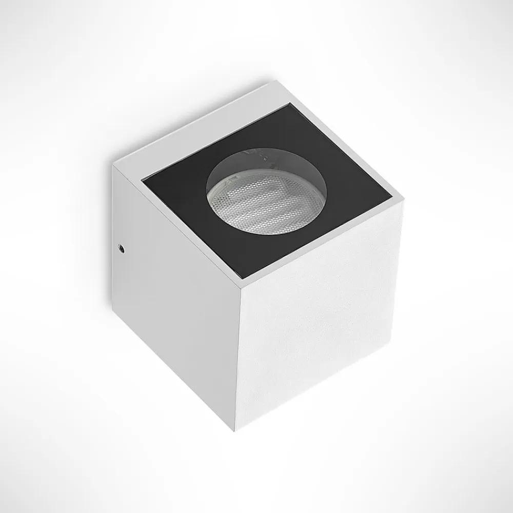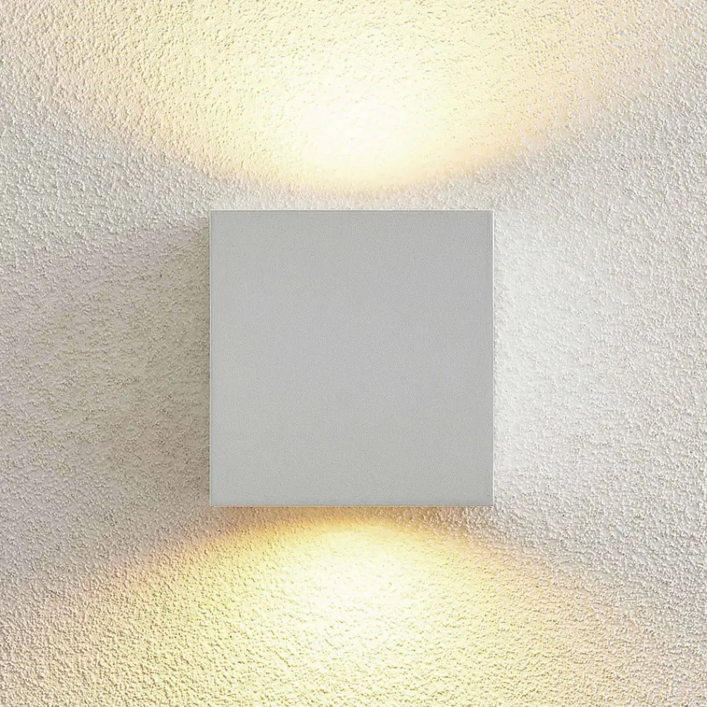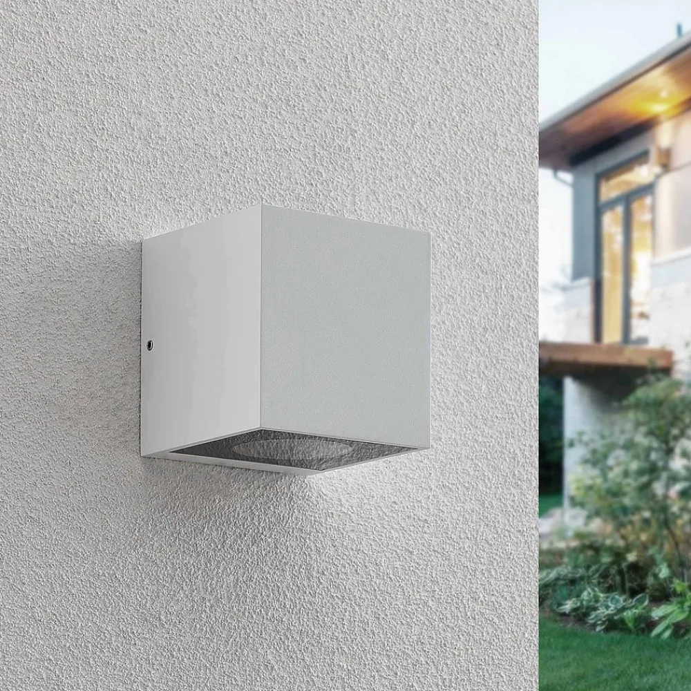 Hvid udendørs væglampe Tassnim af aluminium i kubeform Den udendørs væglampe Tassnim imponerer med sit moderne og symmetriske design. Den er fremstillet af hvid aluminium, og armaturets ydre minder om en terning. Med den rigtige lyskilde får du en pålidelig belysning af terrassen eller indkørslen. IP65-beskyttelsesgraden gør lampen beviseligt støv- og vandtæt. Disse egenskaber gør Tassnim udendørs væglampe perfekt til udendørs områder og trodser vejrforholdene udenfor. Dens enkle udseende gør den også perfekt til brug på ydervægge uden at overskygge resten af den arkitektoniske stil.