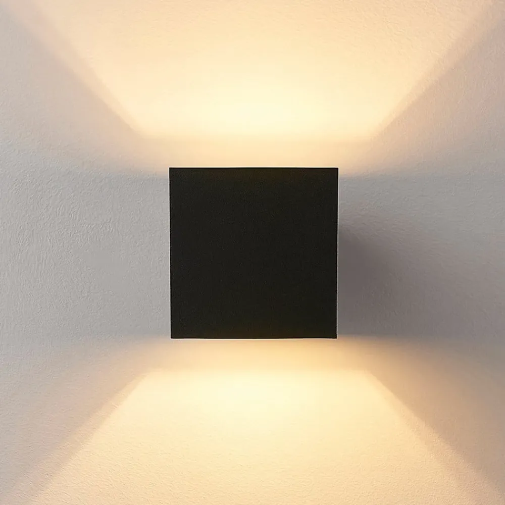 Sort Zuzana væglampe med effektivt lysudslip opad og nedad i et sæt med 2 Zuzana har en kompakt terningeform og er en lyskilde af aluminium med en sort finish. Indersiden af lampen er udstyret med en G9-pære, hvis lys kan slippe ud opad og nedad og skaber en effektiv glød på væggen. Designet har et moderne, men tidløst udtryk og kan nemt integreres i mange miljøer, hvor lyset giver et hyggeligt skær – væglampen leveres i et praktisk sæt med 2 stk