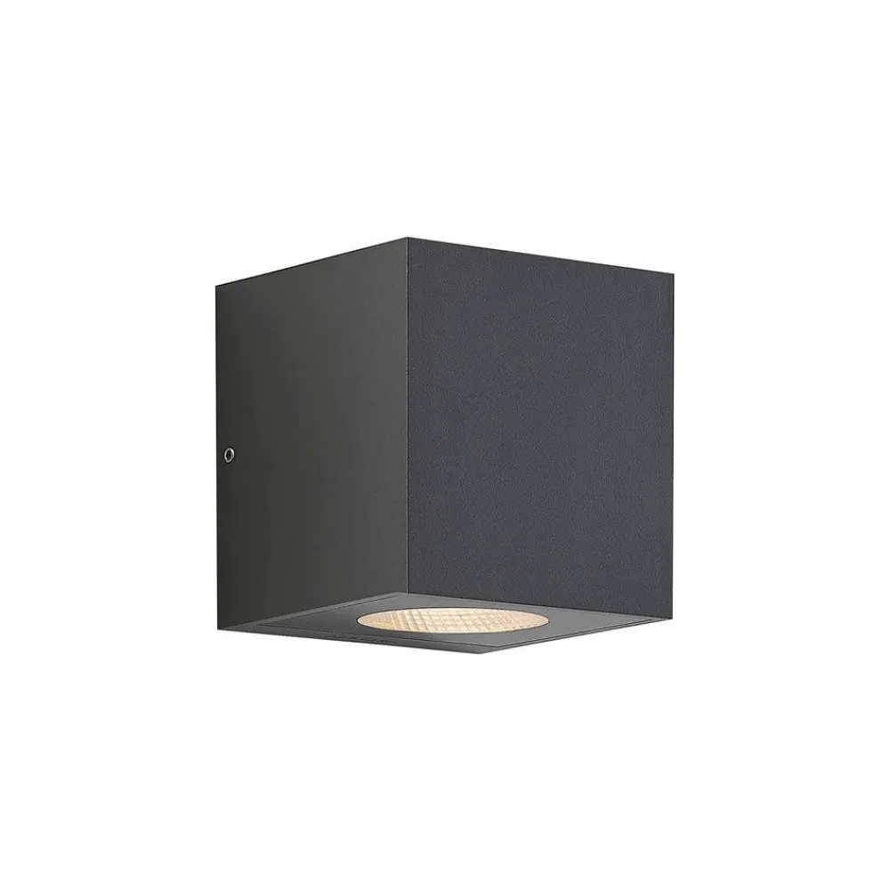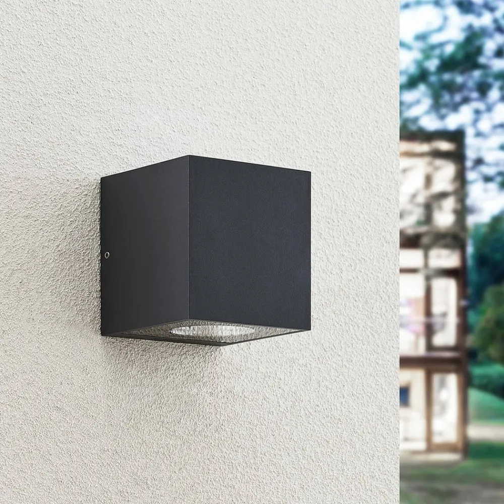Grafitfarvet udendørs LED-væglampe Tassnim af aluminium Den udendørs LED-væglampe Tassnim imponerer med sit enkle udseende. Lampekroppen er lavet af grafitfarvet aluminium, og dens firkantede form minder om en terning. Indeni sidder de fastmonterede LED’er, som giver et perfekt lys til udendørsarealer. Kapslingsgraden IP65 gør armaturet perfekt til installation i en indkørsel eller på en terrasse, da det er støvtæt og beskyttet mod vandstråler. Derfor trodser Tassnim udendørs LED-væglampen ubesværet udendørs vejrforhold og giver også det nødvendige lys. Dens enkle og diskrete design gør, at den nemt kan integreres i husets vægge uden at forstyrre den arkitektoniske stil.