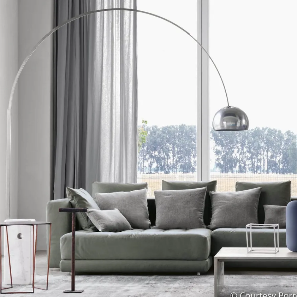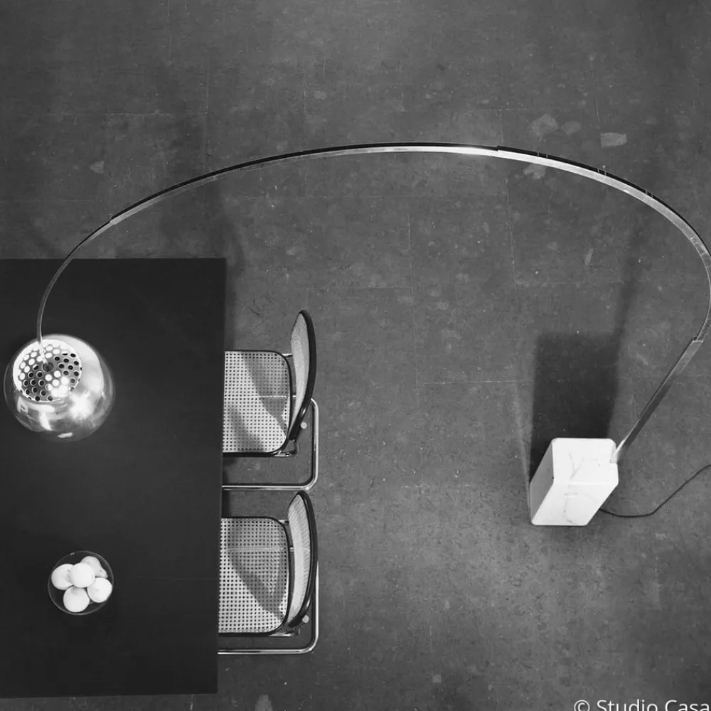 Designerne Achille og Pier Giacomo Castiglioni står bag nogle fantastiske designs for det italienske firma FLOS. Med gulvlampen Arco har de skabt endnu et kunstværk, der fremstår som prototypen på en buelampe. Den stabile fod er lavet af Carrara-marmor, det “hvide guld”, som især er populært blandt billedhuggere. Over marmorsoklen strækker sig en elegant bue af skinnende rustfrit stål, i hvis ende den halvkugleformede lampeskærm er placeret.