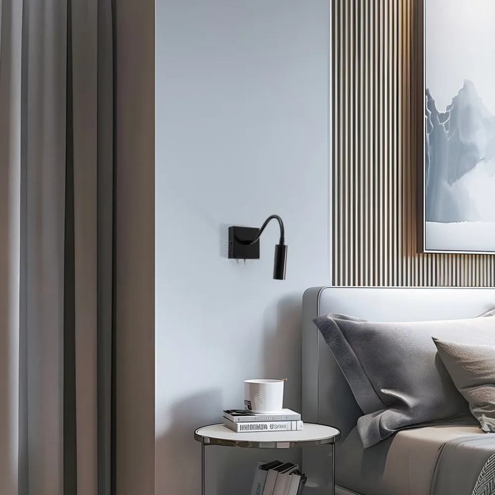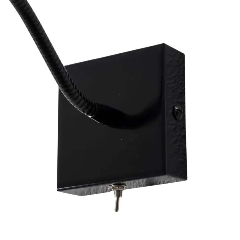 Sort Ojos væglampe med fleksibel arm – perfekt til læselys Ved siden af sengen eller i læsehjørnet er Ojos væglampen en velkommen og praktisk lyskilde. Det lille, cylindriske hoved har plads til en pære af typen G9 og kan orienteres frit takket være den fleksible arm, så Ojos kan bruges som læselampe til at belyse et bestemt område uden at blænde. Væglampen er lavet af stål og har en monokrom sort finish. Der er en vippekontakt på undersiden af det kantede vægbeslag til betjening. Den er produceret i Europa.