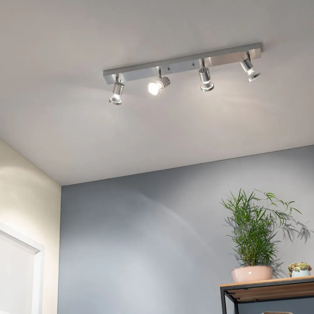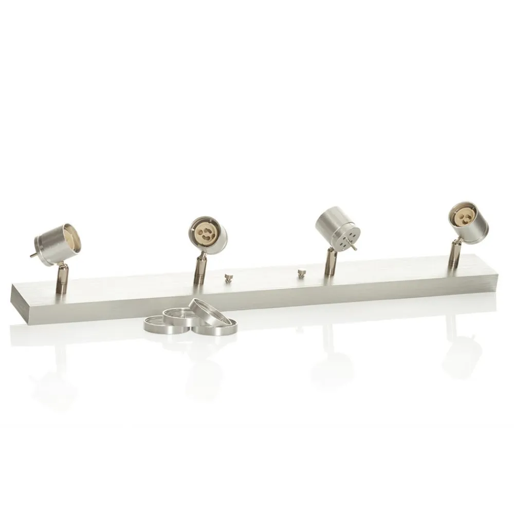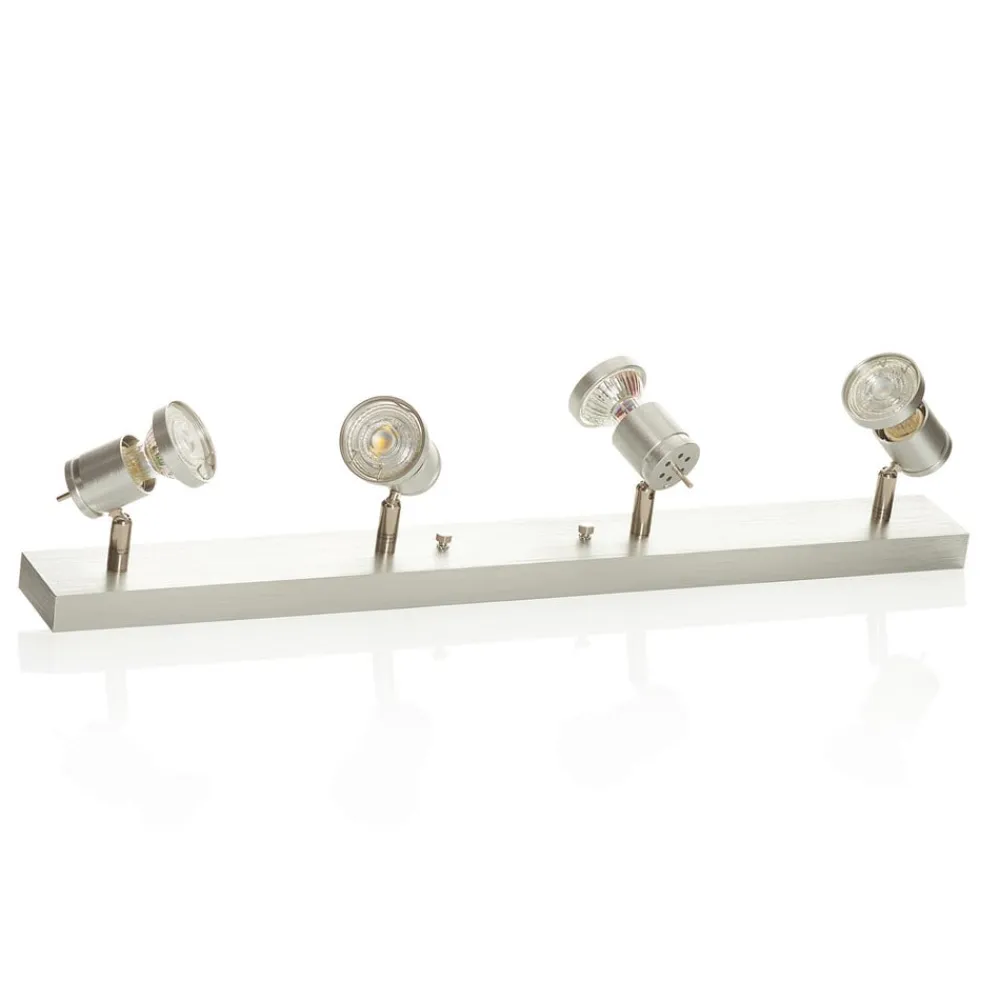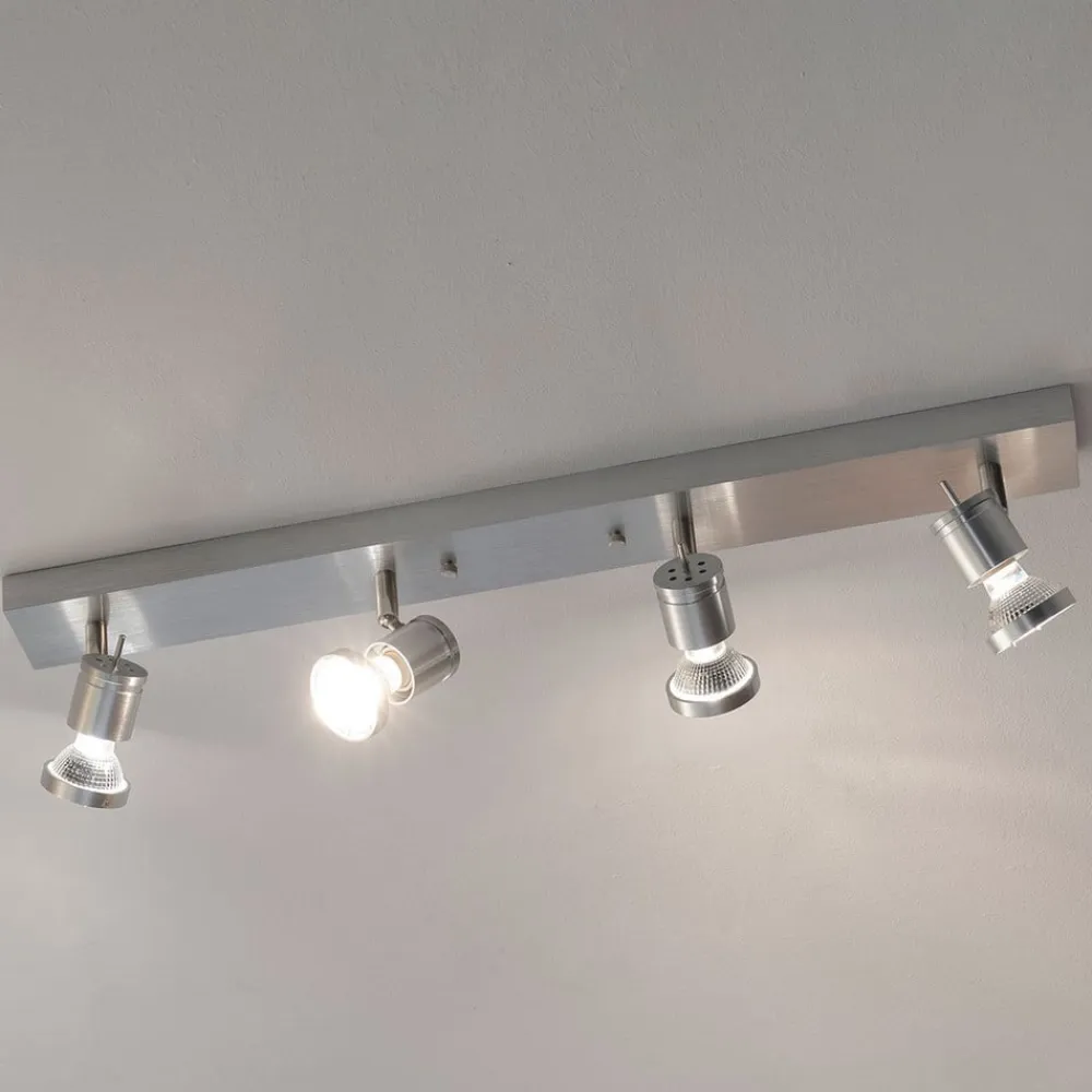 Asto – loftsspot, lineær, inklusive loftsring og fire spots Denne loftsspot med i alt fire spots kan monteres både i loftet og på væggen. Takket være de 310° drejelige spotlights, som også kan drejes 85°, kan der skabes den ideelle belysning til ethvert formål. Det børstede aluminium giver et moderne look over en længde på 63 cm og kan monteres på væggen eller i loftet. En transformer er ikke påkrævet.
