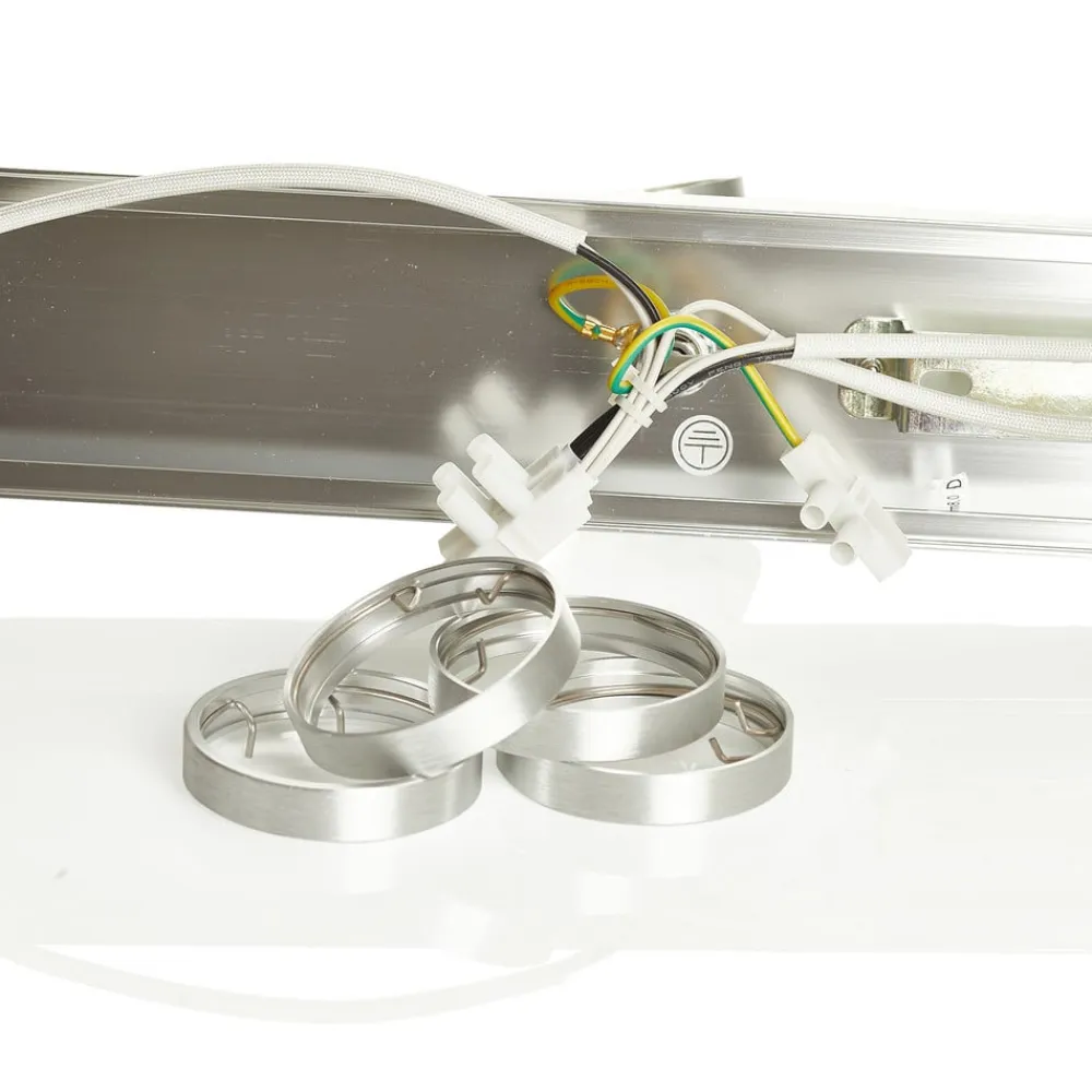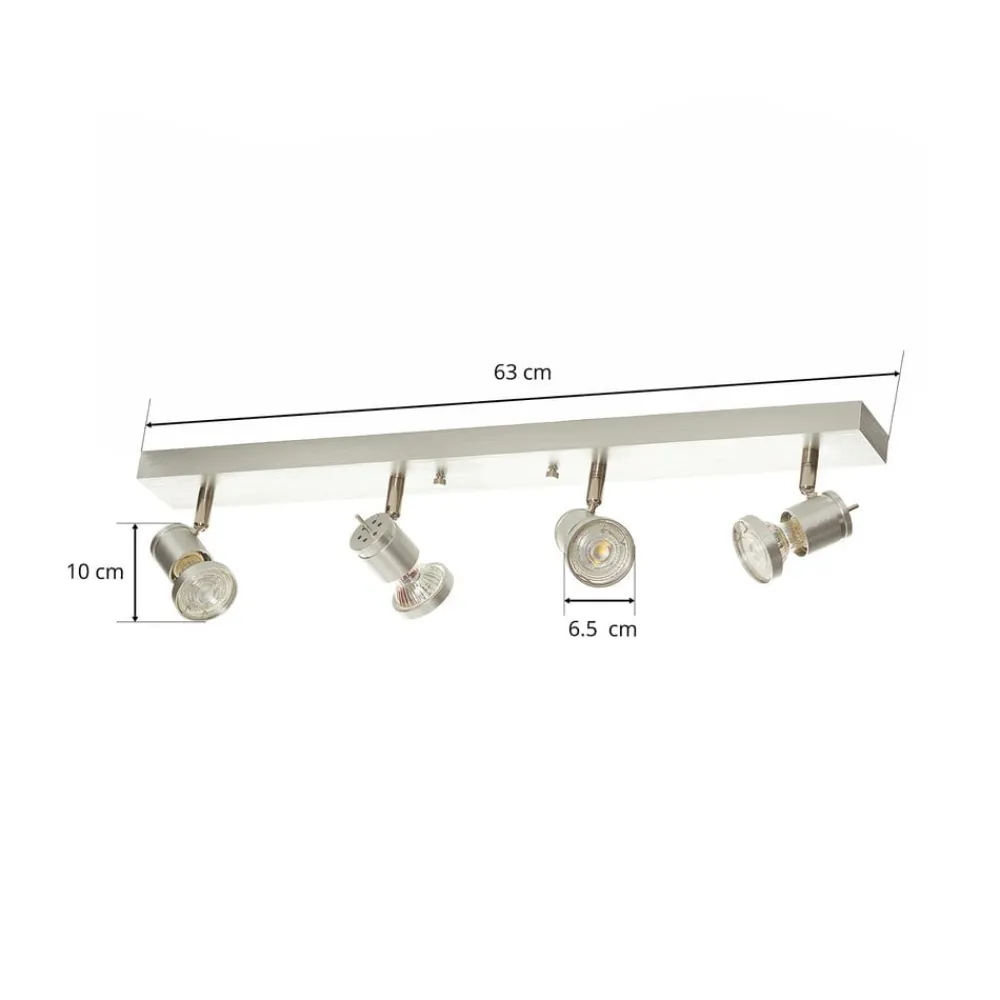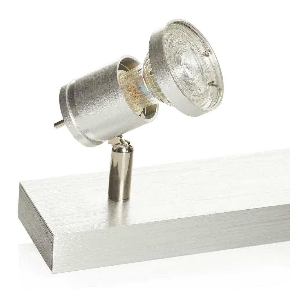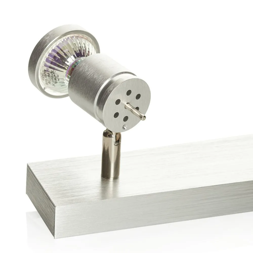 Asto – loftsspot, lineær, inklusive loftsring og fire spots Denne loftsspot med i alt fire spots kan monteres både i loftet og på væggen. Takket være de 310° drejelige spotlights, som også kan drejes 85°, kan der skabes den ideelle belysning til ethvert formål. Det børstede aluminium giver et moderne look over en længde på 63 cm og kan monteres på væggen eller i loftet. En transformer er ikke påkrævet.