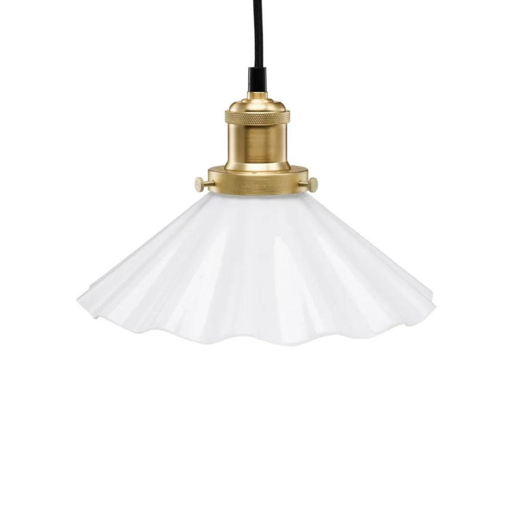 August glaspendel med stik Med sin opalhvide, bølgede glasskærm og fatning i børstet messing minder August-pendlen om traditionelle skomagerlamper. Med en glødepære (medfølger ikke) ser August-pendlen endnu mere autentisk ud. Inkl. tilslutningskabel med stik og afbryder.