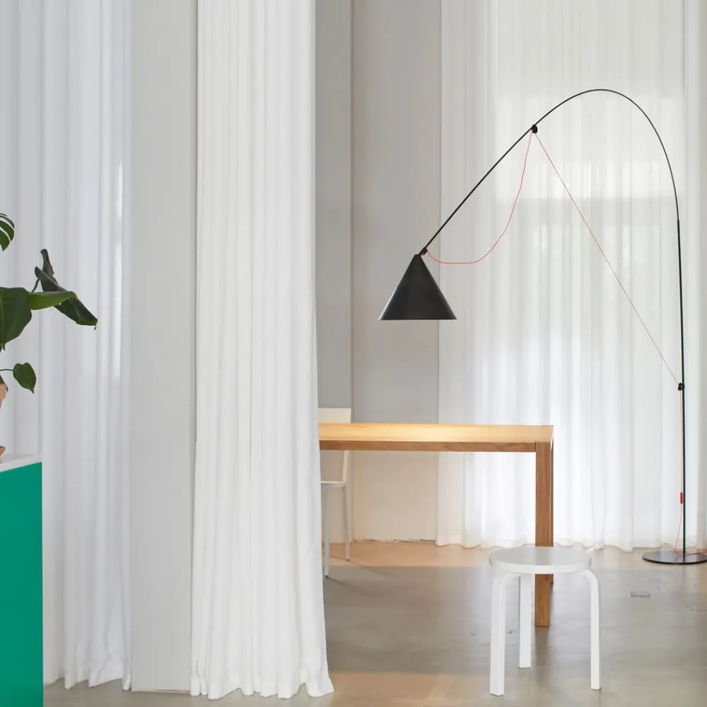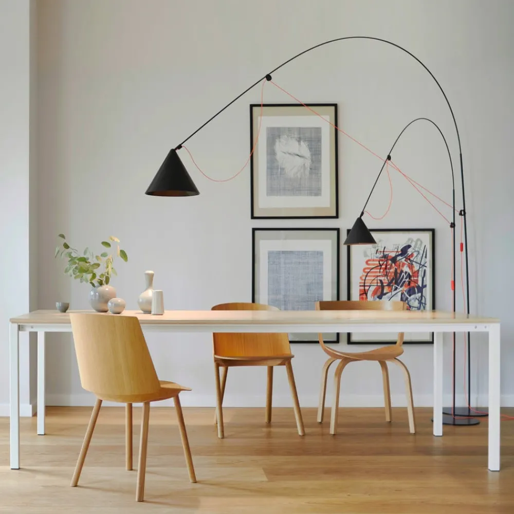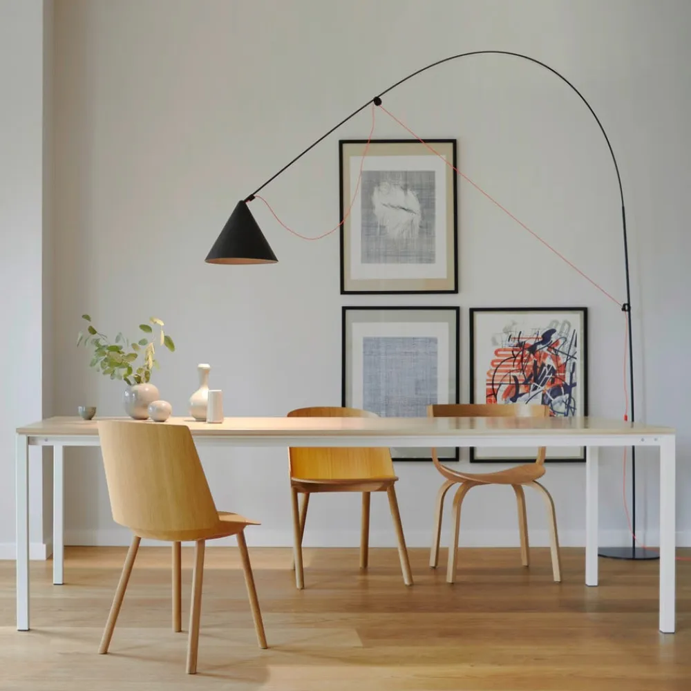 Særligt høj AYNO LED-gulvlampe i variabel bueform, udstyret med lysdæmperMed sin enorme højde, tilpasningsevne og moderne design er AYNO-gulvlampen et moderne blikfang i store rum, både i private og kommercielle/offentlige områder.Ideen om at opnå målbart lys med en justerbar konstruktion er allerede omkring et århundrede gammel. Den stammer fra ingeniøren Curt Fischer (1890 – 1956), som også gjorde sig bemærket som grundlægger af armaturproducenten midgard. I dag er denne virksomhed stadig ansvarlig for den høje kvalitet af armaturernes fremstilling på steder i Tyskland. Med AYNO-serien spænder den industrielle designer Stefan Diez en bue mellem den etablerede idé om retningsbestemt lys og moderne design – og ikke kun i overført betydning: AYNO’s karakteristiske træk er glasfiberarmen, der fjedrer sig fra en base af stål med en rund fod og en lodret rammearm. Armen er oprindeligt lodret på grund af sin iboende spænding og kan vippes nedad ved at flytte to justeringsringe – hvilket ledsages af spændingen af tekstilkablet. Dette gør AYNO-gulvlampen til en buelampe. Det kegleformede hoved af genbrugspolycarbonat/ABS-plast giver med sin drejemulighed en anden mulighed for justering. Bag et struktureret dæksel rummer det et LED-modul af høj kvalitet, der imponerer med fremragende farvegengivelse (CRI ≥ 95) og minimeret blænding (UGR ≤ 12). I tilfælde af en defekt kan det fjernes uden værktøj takket være bajonetlåsen. Til betjening har AYNO en lysdæmperkontakt på stikkablet. – Vinder af den tyske bæredygtighedspris Design 2020