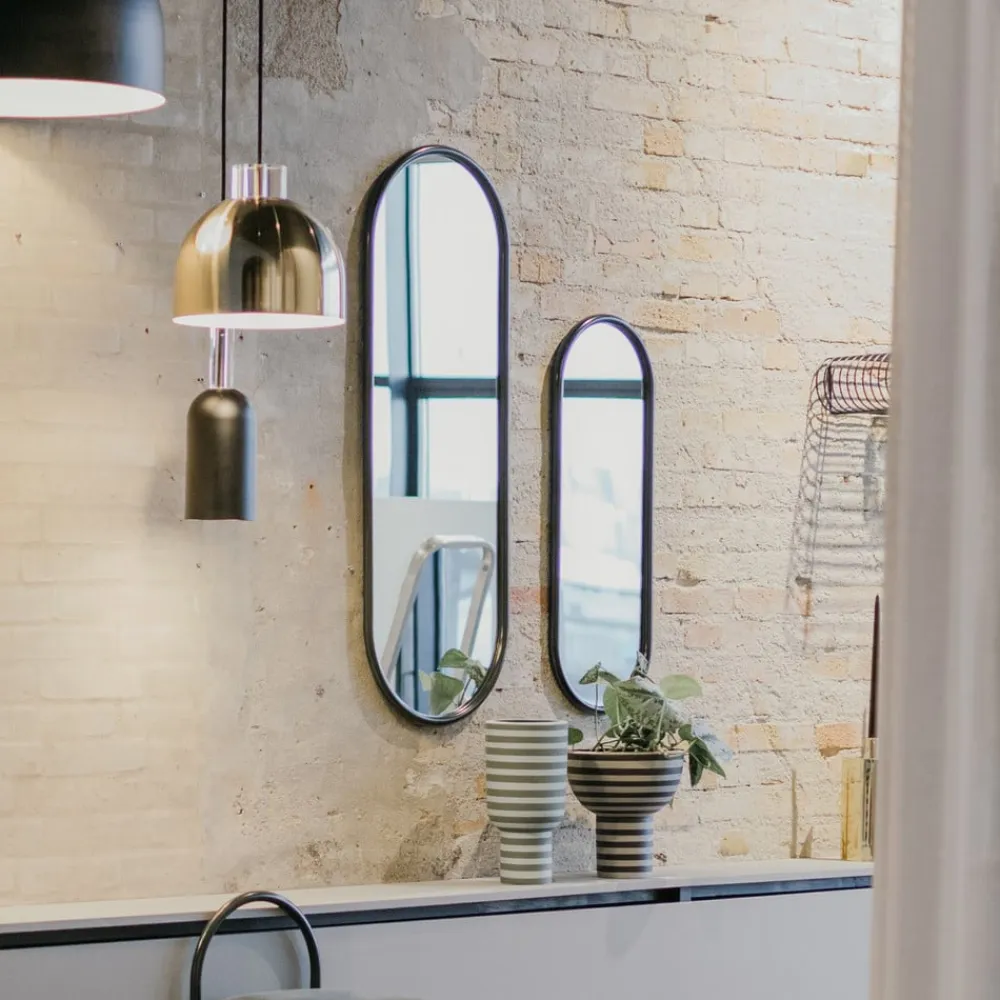 Angui spejl af stål og glas i en oval form Angui vægspejl med sin enkle, rørformede ramme er en skønhed til ethvert badeværelse, gang eller soveværelse. Brug et enkelt spejl eller sæt flere sammen. Denne serie omfatter sofistikerede møbler, som vil understrege din personlige stil. En stålramme giver den nødvendige stabilitet, så Angui også kan monteres vandret på væggen. Produktinformation: Fremstillet af 100 % stål og glas. Plejevejledning: Brug glasrens på spejlet for at fjerne snavs og støv. Tør spejlet af, så det bliver tørt og skinnende. Undgå at gnide med en grov klud, da det kan beskadige overfladen. Nogle rengøringsmidler kan efterlade striber på glasset, så brug et middel, der er egnet til glas.