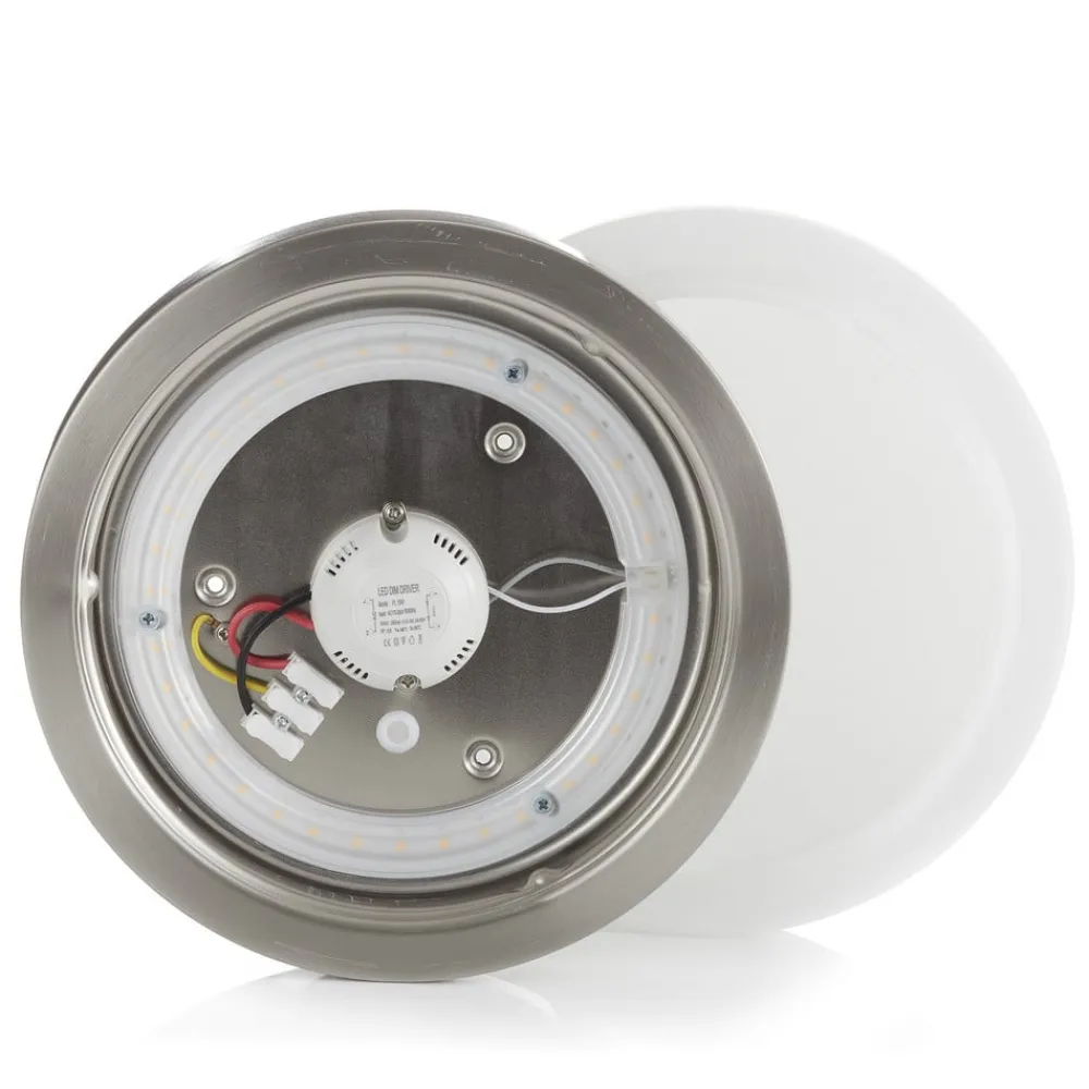 Moderne, tidløs og effektiv – det er den runde LED-loftlampe Babylon. Det tilbageholdende design passer til enhver boligstil og er dermed en et universelt multitalent i forhold til belysningen. Lampen monteres på en sølvfarvet holder, der sættes på væggen eller i loftet. Der sidder helt præcist en hvid lampeskærm af glas på og skaber en blændfri og generøs belysning. Til større rum er der ligeledes muligheden for at placere to eller flere Babylon-væglamper i et rum. En yderligere fordel er muligheden for at dæmpe lyset i tre forskellige lysstyrkeniveauer – ved at trykke på vægkontakten flere gange – da lampen dermed kan levere den korrekte belysning, afhængigt af situationen. Med kapslingsklasse IP44 er loftlampen Babylon beskyttet mod støv og vandstænk, der er altså ikke noget i vejen for montering i vådrum.