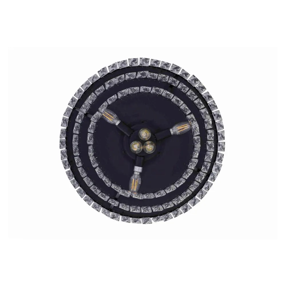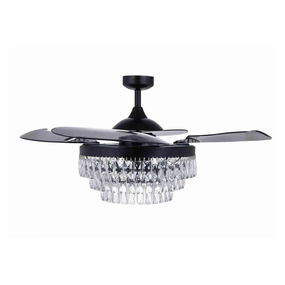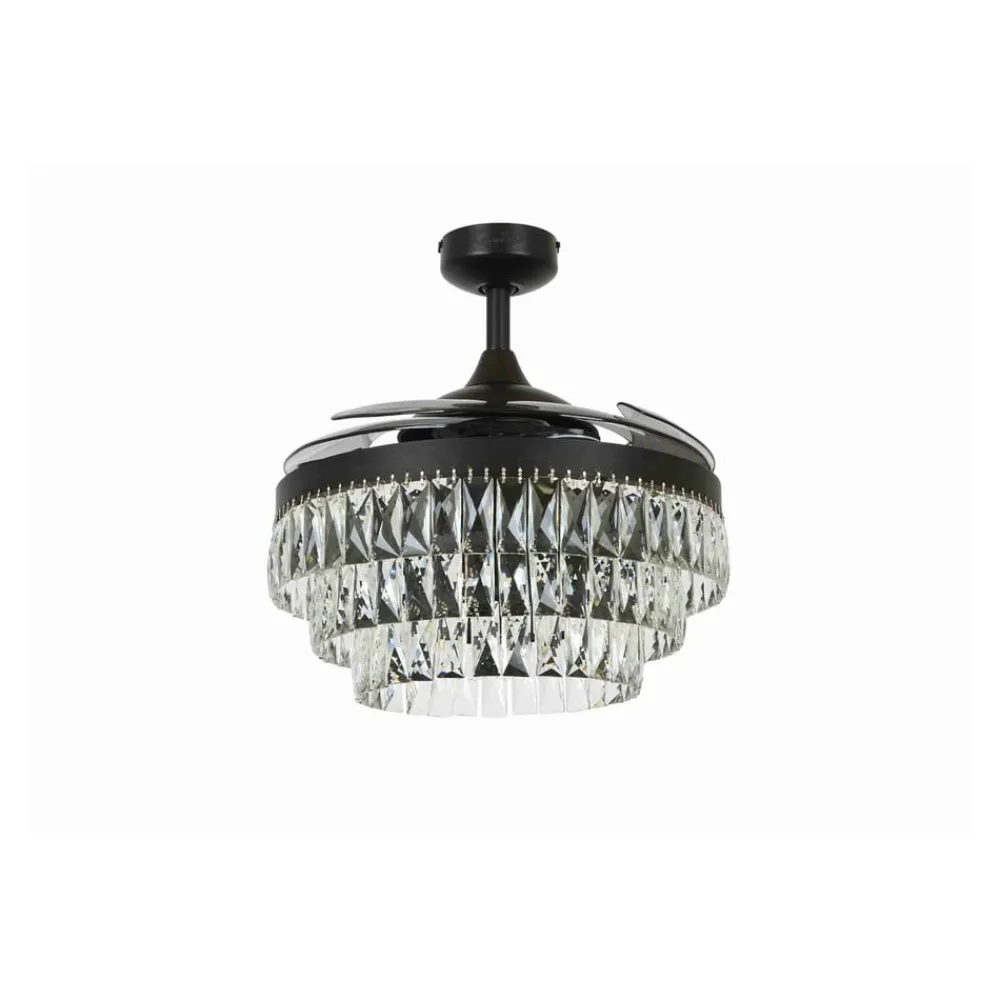 I krystallook – lysende loftventilator Fanaway Veil med fire udtrækkelige vinger og fjernbetjening Fanaway Veil er en elegant kombination af klassisk loftslampe og ventilator i krystal. De fire akrylblade er kun udfoldede i ventilatortilstand; når de udelukkende bruges som loftslampe, forsvinder de over huset. De fire medfølgende varmhvide E14 LED-lamper med glødetrådslook er placeret over et ophæng i krystallook, som giver en funklende lysoplevelse. Om sommeren giver Fanaway Veil en kølig brise. Om vinteren understøtter den reversible løberetning varmefunktionen. Også velegnet til nedhængte lofter. Funktioner: Fanaway Veil er udstyret med en vekselstrømsmotor, der muliggør tre hastighedsniveauer og en reversibel rotationsretning (justerbar på huset). Der medfølger passende lyskilder. Ventilator- og lysfunktionerne styres med den medfølgende fjernbetjening. Tekniske data: – Motorhastighed: 255/195/141 o/min – Motoreffekt: maks. 56 W – Luftcirkulation: maks. 180 m³/min Bemærk: Den medfølgende fjernbetjening kræver to AAA-batterier (medfølger ikke).