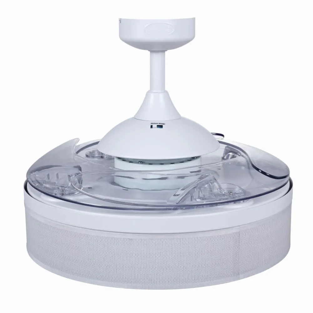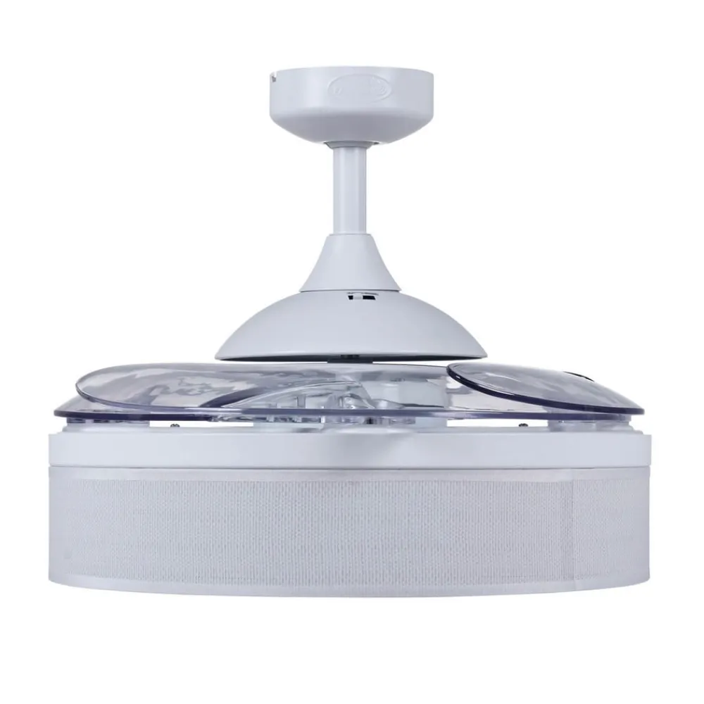 I hvid: Fanaway Fraser loftventilator med transparente, udtrækkelige vinger og belysning Fraser-loftventilatoren har et tidløst enkelt hvidt design og kan bruges enten som en belyst ventilator eller bare som generel belysning takket være de fire udtrækkelige, transparente akrylvinger. Monteret med tre E27-fatninger. Uden pærer. Funktioner Den firebladede Fanaway Fraser-loftventilator er effektiv, når det gælder luftcirkulation og rumbelysning. De forskellige hastigheder kan indstilles med kontakten, der er integreret i motorhuset, eller med den medfølgende fjernbetjening – Sommer-/vinterfunktion kan indstilles (med kontakten på huset) Fanaway Fraser kan installeres på lofter med en hældning på op til 15° og leveres med en forlængerstang.
