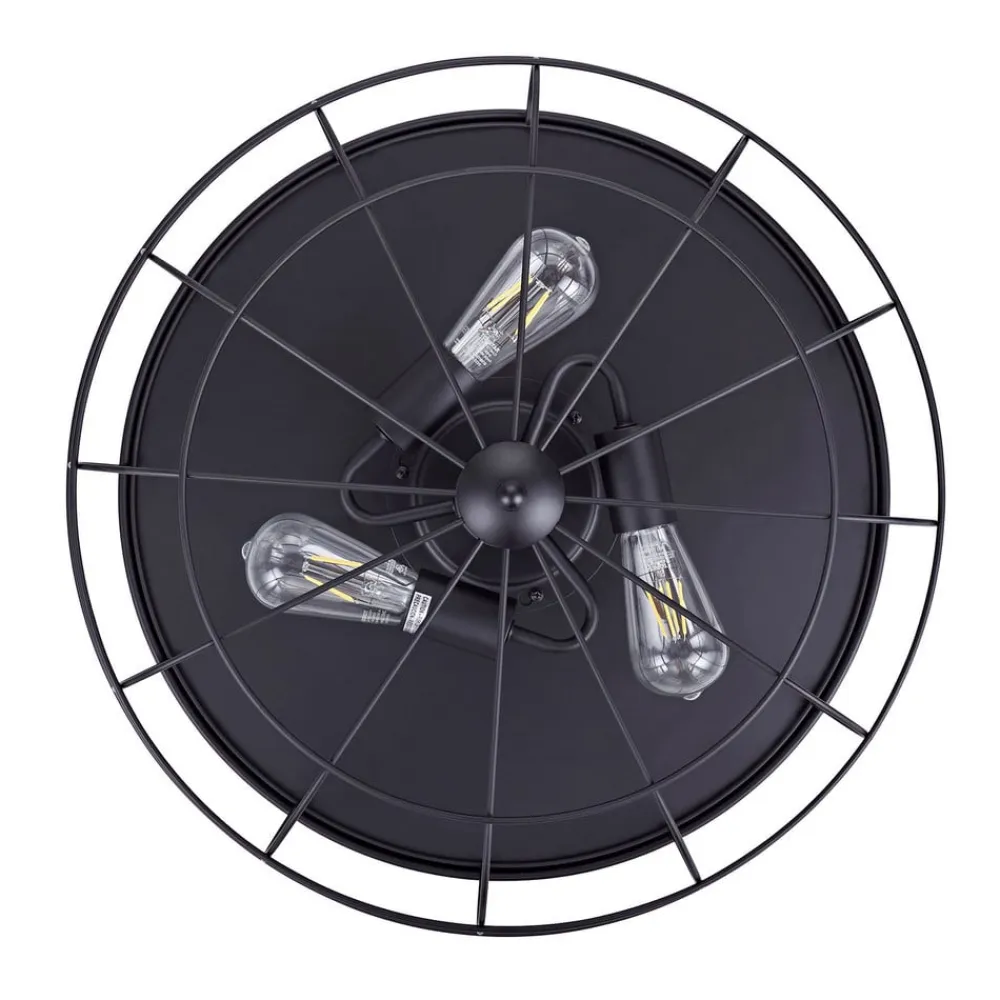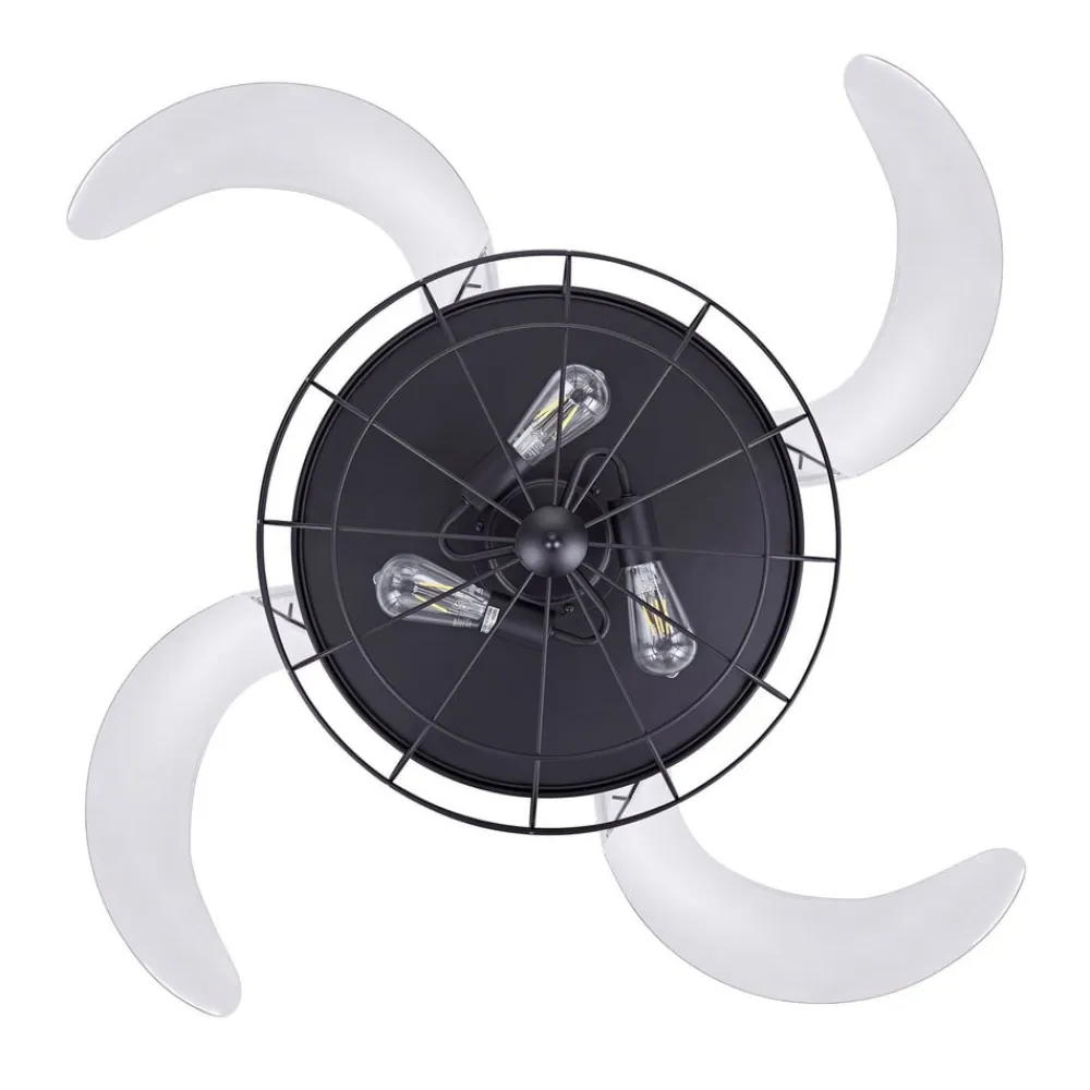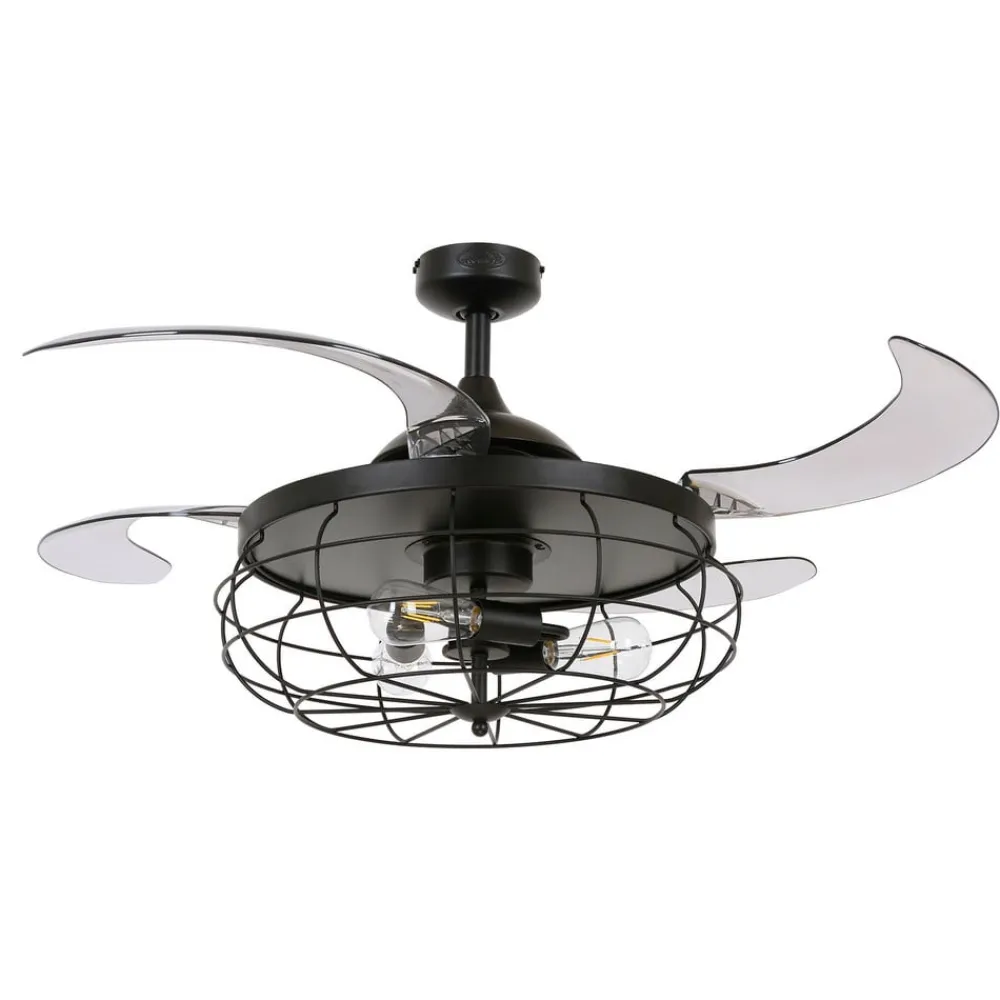 Fanaway Industri loftventilator med fire optrækkelige vinger og lys med tre rustikke LED-lamper Fanaway Industri loftventilator er absolut imponerende med sin alsidighed og industrielle touch. Om nødvendigt kan vingerne foldes væk, så der kun er en elegant loftslampe med tre dekorative ST64 rustikke lamper i filament-look tilbage. Funktioner Ventilatorens hastighed kan justeres i tre trin. Ud over behagelig afkøling om sommeren giver Fanaway Industri også merværdi om vinteren, for takket være den reversible rotationsretning leder ventilatoren den varme luft under loftet tilbage i opholdsområdet og understøtter dermed opvarmningens effektivitet. Fanaway Industri styres via den medfølgende radiofjernbetjening. Tekniske data – Hastighed: 130/175/230 o/min – Ventilatoreffekt ved maksimal hastighed: 60 W – Luftcirkulation: maks. 180 m³/min – Egnet til 3 x E27-pærer, maks. 25 W pr. stk