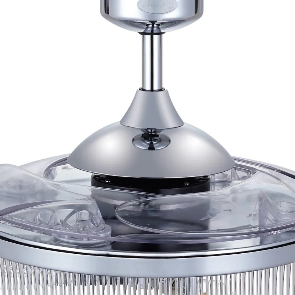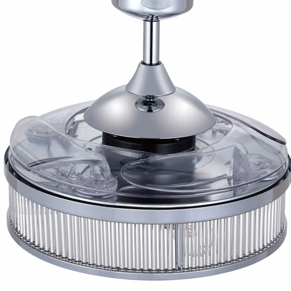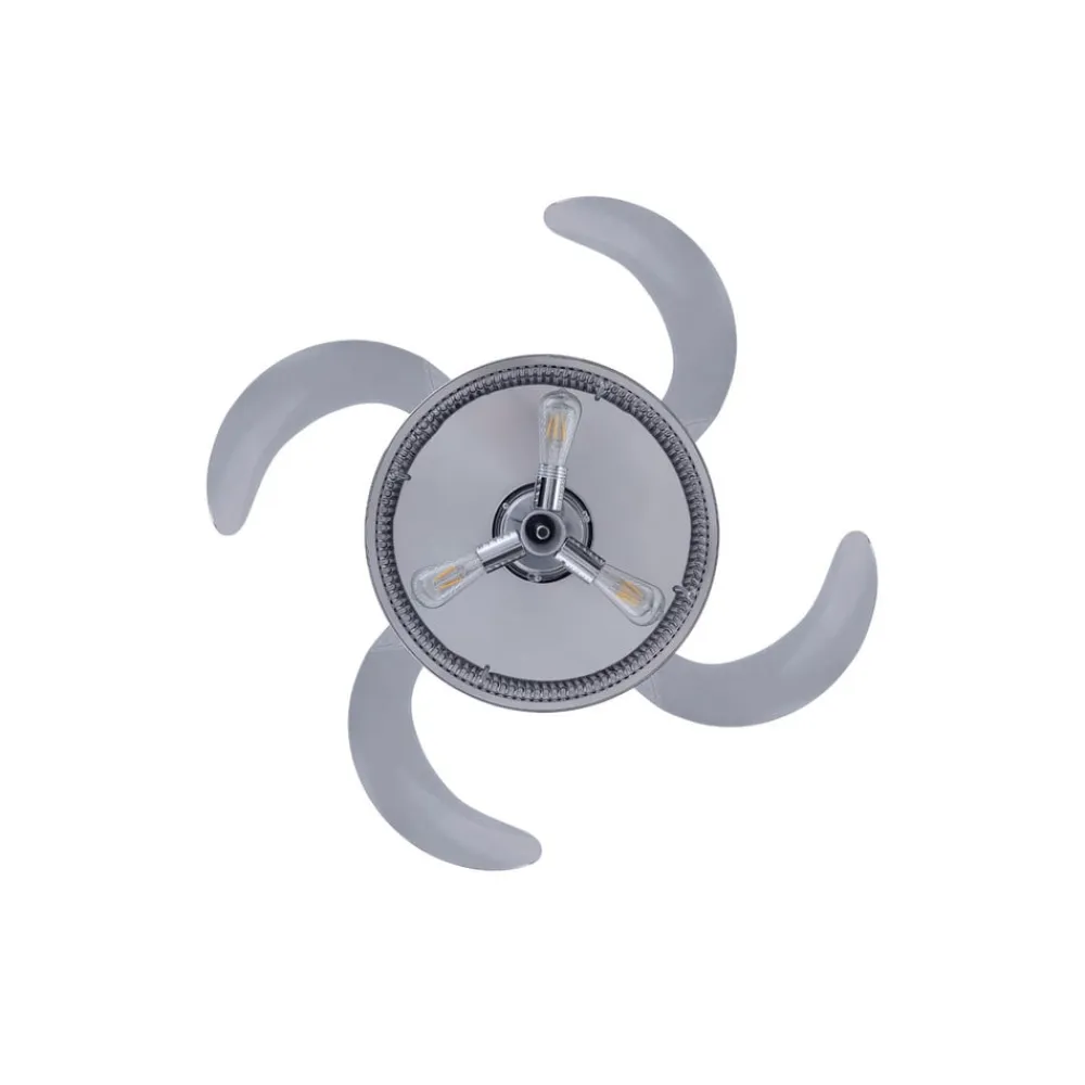 Fanaway Corbelle loftsventilator i krystallook med tre E27 LED-pærer, fire indtrækkelige vinger og fjernbetjening Fanaway Corbelle er en loftsventilator og loftslampe i ét; denne kombination er særlig elegant med fire klare akrylvinger, der trækkes usynligt ind over huset, når ventilatoren er slukket. De tre medfølgende, varmhvide E27 LED-rustikglødelamper er placeret på undersiden af huset, som har en kromfinish og gennemsigtige stænger på siderne. Om sommeren giver Fanaway Corbelle en kølig brise. Om vinteren understøtter den reversible rotationsretning varmefunktionen. Også velegnet til nedhængte lofter. Funktioner: Fanaway Corbelle er udstyret med en vekselstrømsmotor, der muliggør tre hastighedsniveauer og en reversibel rotationsretning (justerbar på huset). Der medfølger passende lyskilder. Ventilator- og lysfunktionerne styres med den medfølgende fjernbetjening. Tekniske data: – Motorhastighed: 248/185/136 o/min – Motoreffekt: maks. 57 W – Luftcirkulation: maks. 180 m³/min Bemærk: Den medfølgende fjernbetjening kræver to AAA-batterier (medfølger ikke).