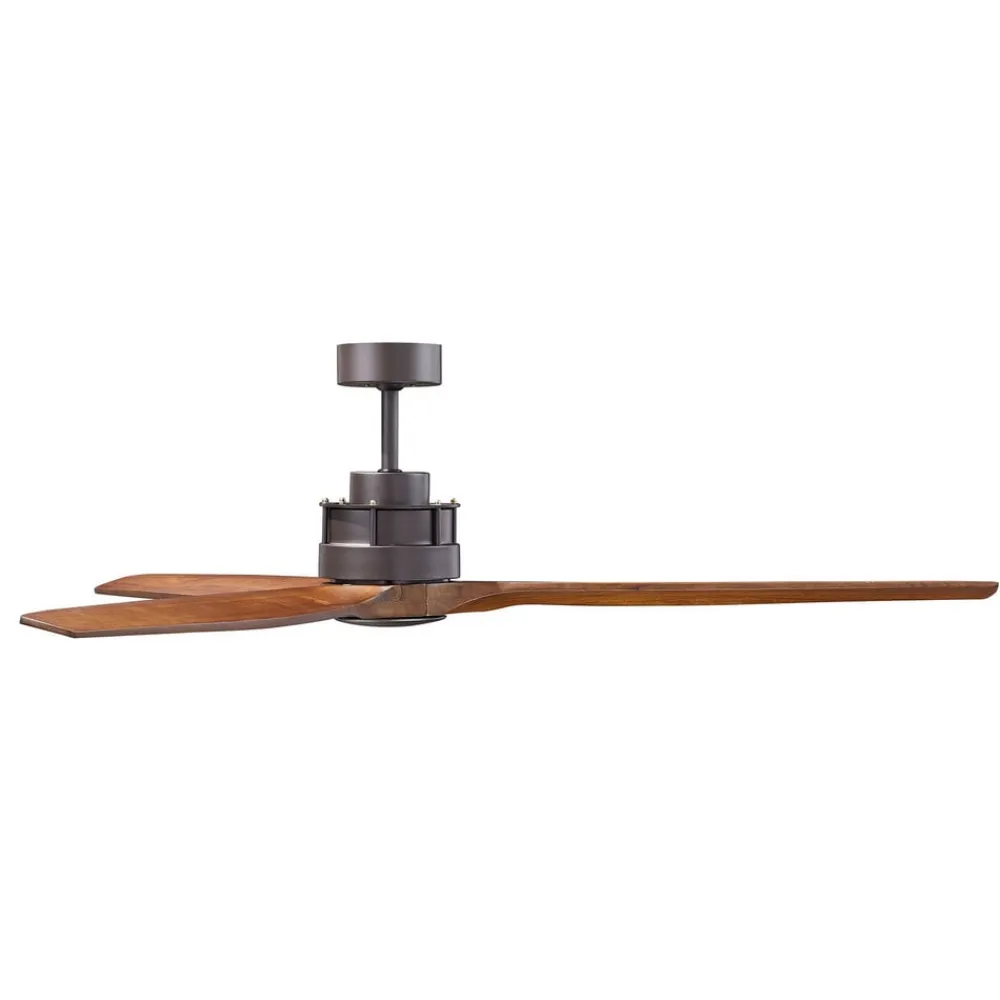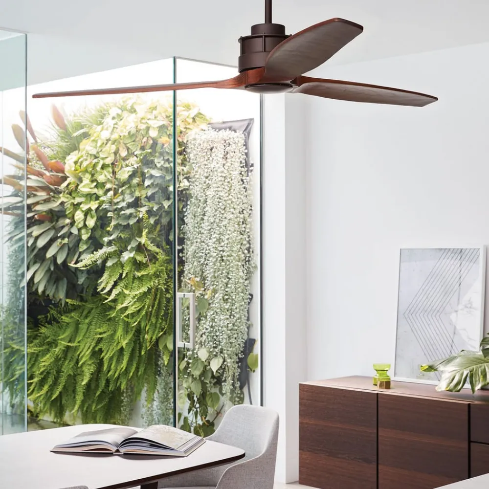Letløbende loftsventilator Airfusion Akmani med massive trævinger Loftsventilatoren Airfusion Akmani er et blikfang af høj kvalitet til indendørs brug med sine tre trævinger i et mørkt Koa-look, som suppleres af et metalhus i en olieret bronzefinish. Takket være den særligt støjsvage DC-motor er Airfusion Akmani også den foretrukne ventilator i soveværelset. Funktioner Seks hastighedsniveauer giver mulighed for præcis justering af luftcirkulationen. Mens ventilatoren giver en behagelig brise om sommeren, bidrager den om vinteren til effektiv brug af den luft, der opvarmes af varmesystemet, ved at vende rotationsretningen. Alle indstillinger styres ved hjælp af den medfølgende fjernbetjening. Tekniske data – Motoreffekt: maks. 36 W – Hastigheder: 40/70/95/125/150/175 o/min – Cirkuleret luftstrøm: maks. 223 m³/min
