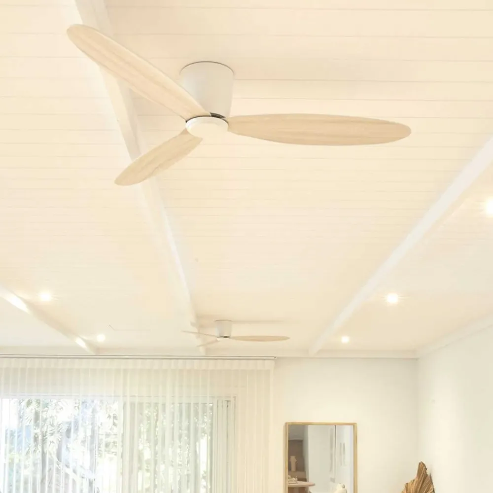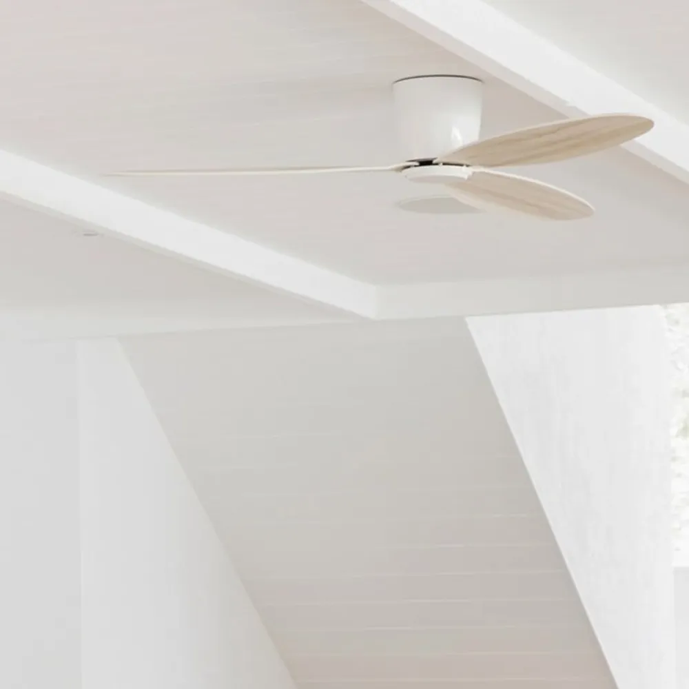 Loftventilatoren Airfusion Radar har et robust, hvidt plastikhus og tre trævinger i egetræsfarve. Takket være DC-motoren er Airfusion Radar særdeles støjsvag og derfor ideel til soveværelset. Også egnet til nedhængte lofter.