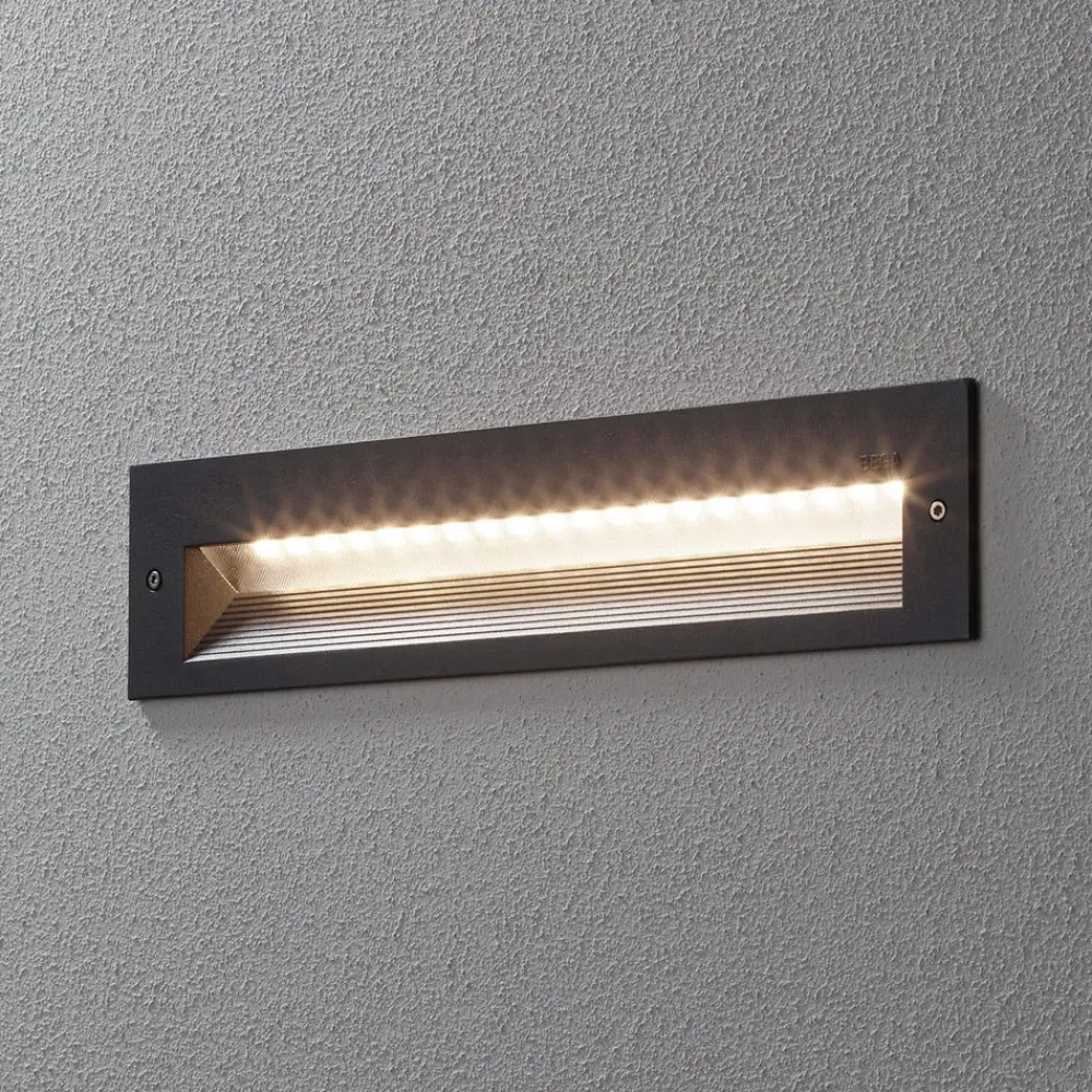 LED-vægindbygningslampe med asymmetrisk lysfordeling Denne LED-vægindbygningslampe er fremstillet af aluminium og rustfrit stål og har en diskret farve. Den monteres i væggen og flugter med facaden. På tværs af armaturets bredde er der et indhak, som er formet som en trekant indadtil og rummer de varmhvide LED’er i en lidt skjult position. Formen sikrer en asymmetrisk lysfordeling, så lysstrålen rettes præcis derhen, hvor der er brug for den. Det forhindrer også blænding, hvilket er særligt vigtigt i mørke. Det indbyggede armatur kan bruges udendørs på trapper, gangbroer, husfacader eller endda indgangspartier og er ideelt udstyret til dette takket være IP65-klassificeringen. Det er også velegnet til gennemfortrådning og sørger for sikker belysning om natten og pålidelig orientering, især i kombination med andre armaturer.